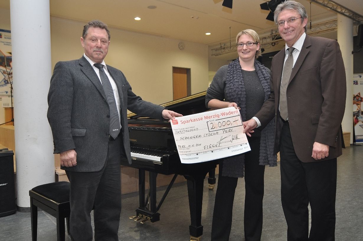 Im deutsch-luxemburgischen Schengen - Lyzeum in Perl / Deutschland fand vor einigen Tagen ein Weihnachtskonzert statt, dem viele Besucher beiwohnten. Die Blässer klasse 5C + 6C eröffneten das Konzert mit Morgen kommt der Weihnachtsmann und Jingle Bells gefolgt von der Blässer Klasse 6C Oh du Fröhliche und When the Saints. Es folgte dann eine Chorklasse der 5C + 6 C mit verschiedenen weihnachtlichen Liedern, ehe Charlotte Kremer und Sally Schmit mit ihren Trompeten die traditionelle englische Komposition The First Noel vortrugen. Kira Hein ( Flöte ), Léonie Muller (Klarinette) und Lea Sausy( Saxofon ) musizierten zu dreien Walter Roehr. Es folgte dann die eigentliche Schecküberreichung des Fördervereins des Lyzeum, der größtenteils von Spenden der Eltern lebt. Im deutsch-luxemburgischen Schengen-Lyzeum sind zur Zeit 620 Schüler(innen ) eingeschrieben, wovon zirka 40 % aus dem Luxemburger Grenzgebiet kommen. Als Vize-Präsident des Förderverein überreichte Marc Kemmer den stolzen Scheck in Höhe von 2000.- € an das Direktionskollegium des Lyzeums Volker Staudt und Marion Zenner . Dieses Geld war bestimmt, um einen Flügel für die Schule anzuschaffen. Der Direktor Volker Staudt bedankte sich recht herzlichst bei dem Förderverein für die innovative Anschaffung. Nach Anschluss an die Schecküberreichung folgte eine Vorführung eines Films über das Schengen-Lyzeum, der durch das Interreg-Programm der EU gefördert wurde
