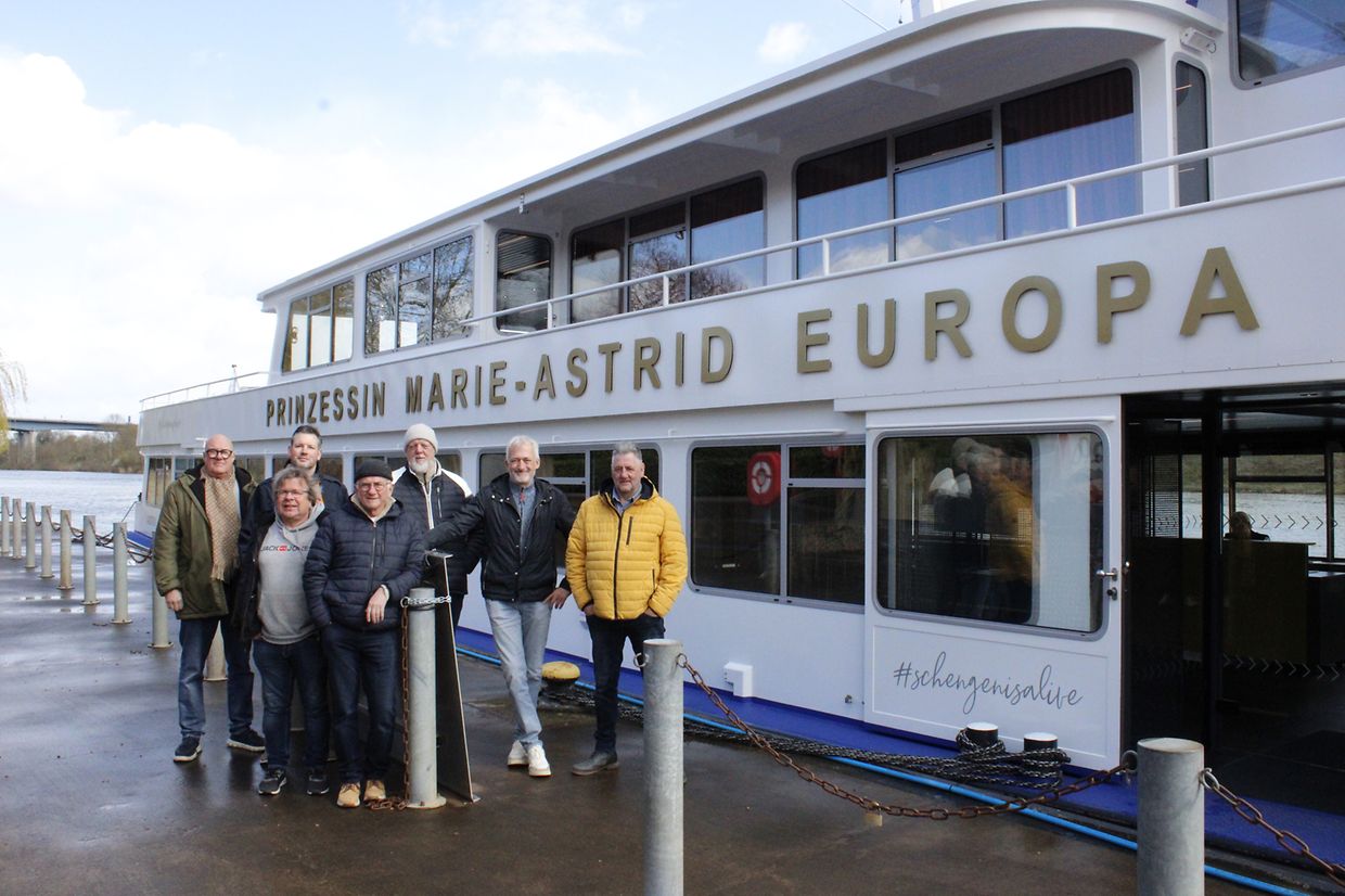 Auch Schloss Schengen beeindruckte die Wanderer. Der Bau erhebt sich, umgeben von einem barocken Garten, auf den Fundamenten einer mittelalterlichen Wasserburg. Ein alter Turm erinnert noch heute an diese Zeit. In dem hellen Speisesaal mit Kronleuchtern, großen Spiegeln und kunstvoll verzierten Wänden ließ sich die Gruppe regionale Spezialitäten und den ausgezeichneten Moselwein schmecken. Zu den einstigen Gästen des Schlosses zählte Victor Hugo, dessen Zeichnung des Turms noch heute die Etiketten der Weine „Château de Schengen“ ziert. Beim Spaziergang entlang der Mosel bis nach Perl wurde der Wandel spürbar: An den Stellen, an denen früher Schlagbäume standen, können heute täglich Tausende Menschen die Grenze frei überqueren. Der Ausflug mit öffentlichen Verkehrsmitteln wurde so zu einer gelungenen Verbindung von Natur, Geschichte und europäischem Geist.