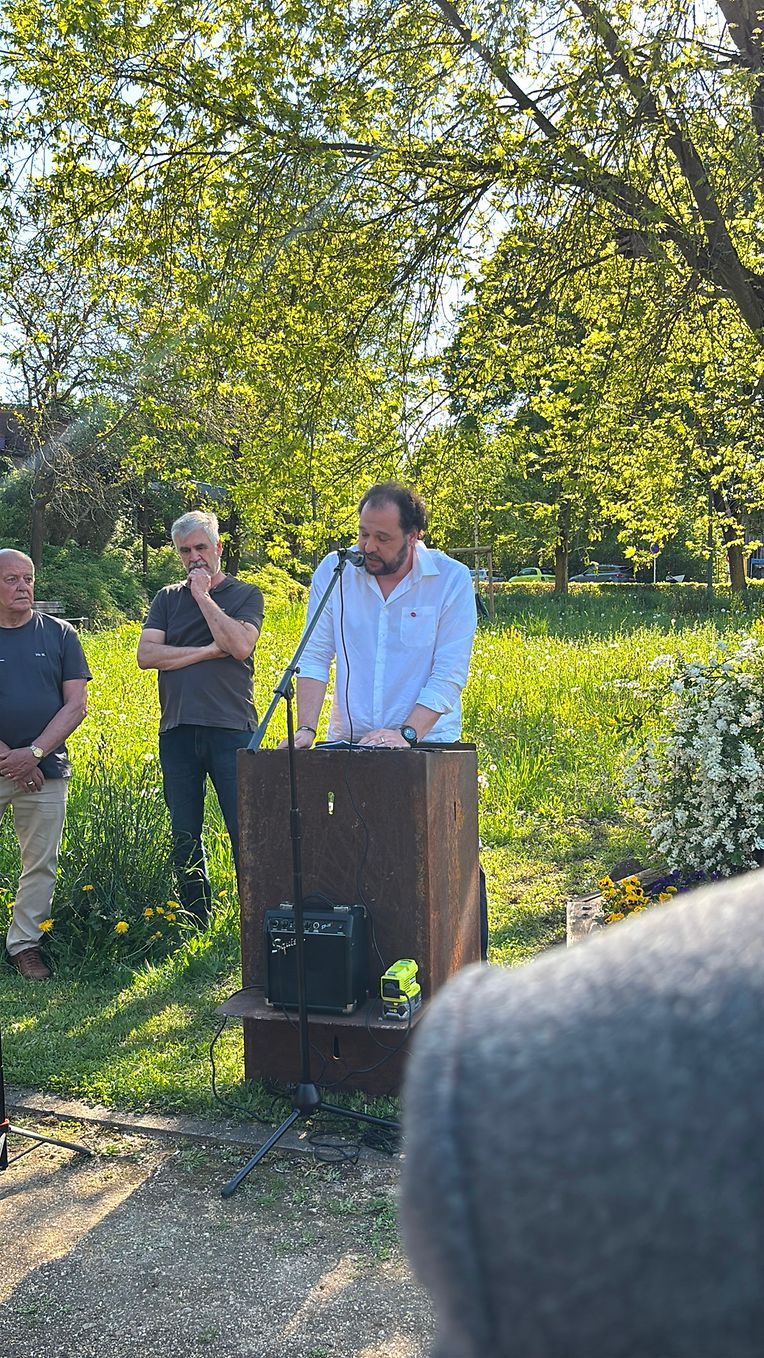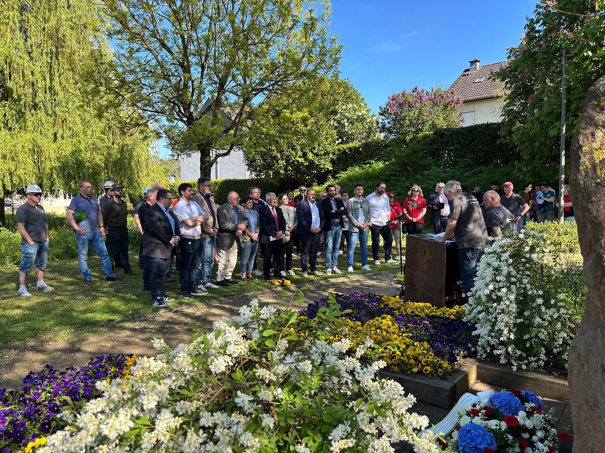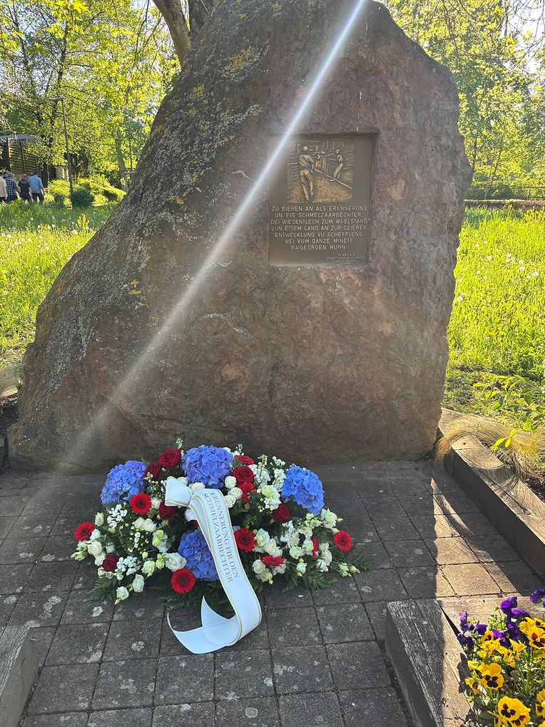 Beim Gedenksteen an der “Cité um Benn“ si Blummen néiergeluecht ginn an an hiren Usproochen hunn den Här Paul Weimerskirch (Buergermeeschter), den Här Alain Günther (Schmelzaarbechter Musée), den Här Andrea Spigarelli (OGBL), den Här Georges Conter (LCGB) an den Här Yves Biwer (AGORA) den Aarbechter geduecht ouni därer Fläiss a Schweess eist Land net dat wär wat et ass. Dofir huet all eenzele Schmelzaarbechter eisen déifste Respekt verdéngt.