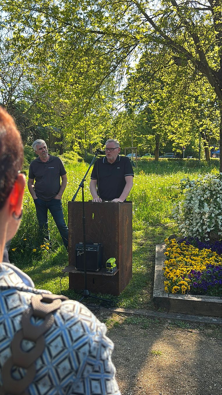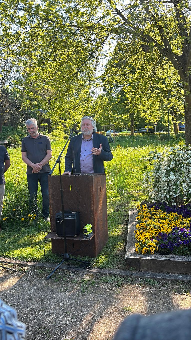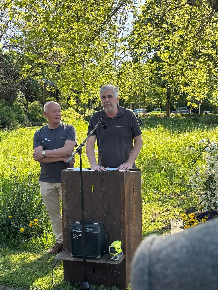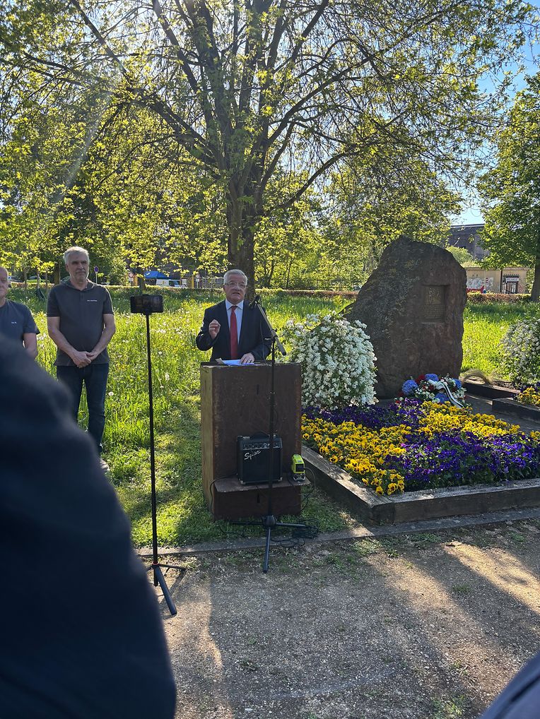 Beim Gedenksteen an der “Cité um Benn“ si Blummen néiergeluecht ginn an an hiren Usproochen hunn den Här Paul Weimerskirch (Buergermeeschter), den Här Alain Günther (Schmelzaarbechter Musée), den Här Andrea Spigarelli (OGBL), den Här Georges Conter (LCGB) an den Här Yves Biwer (AGORA) den Aarbechter geduecht ouni därer Fläiss a Schweess eist Land net dat wär wat et ass. Dofir huet all eenzele Schmelzaarbechter eisen déifste Respekt verdéngt.