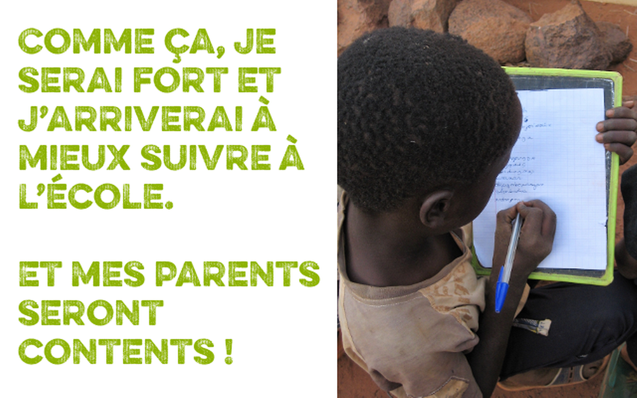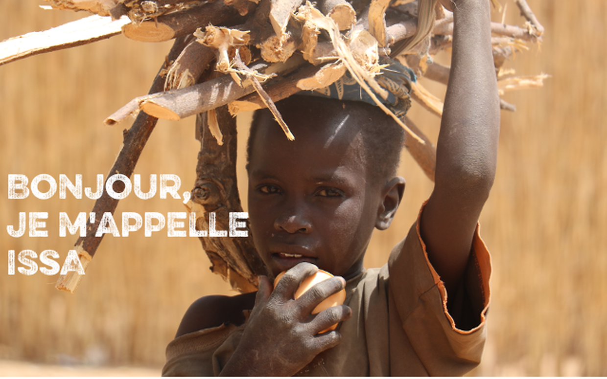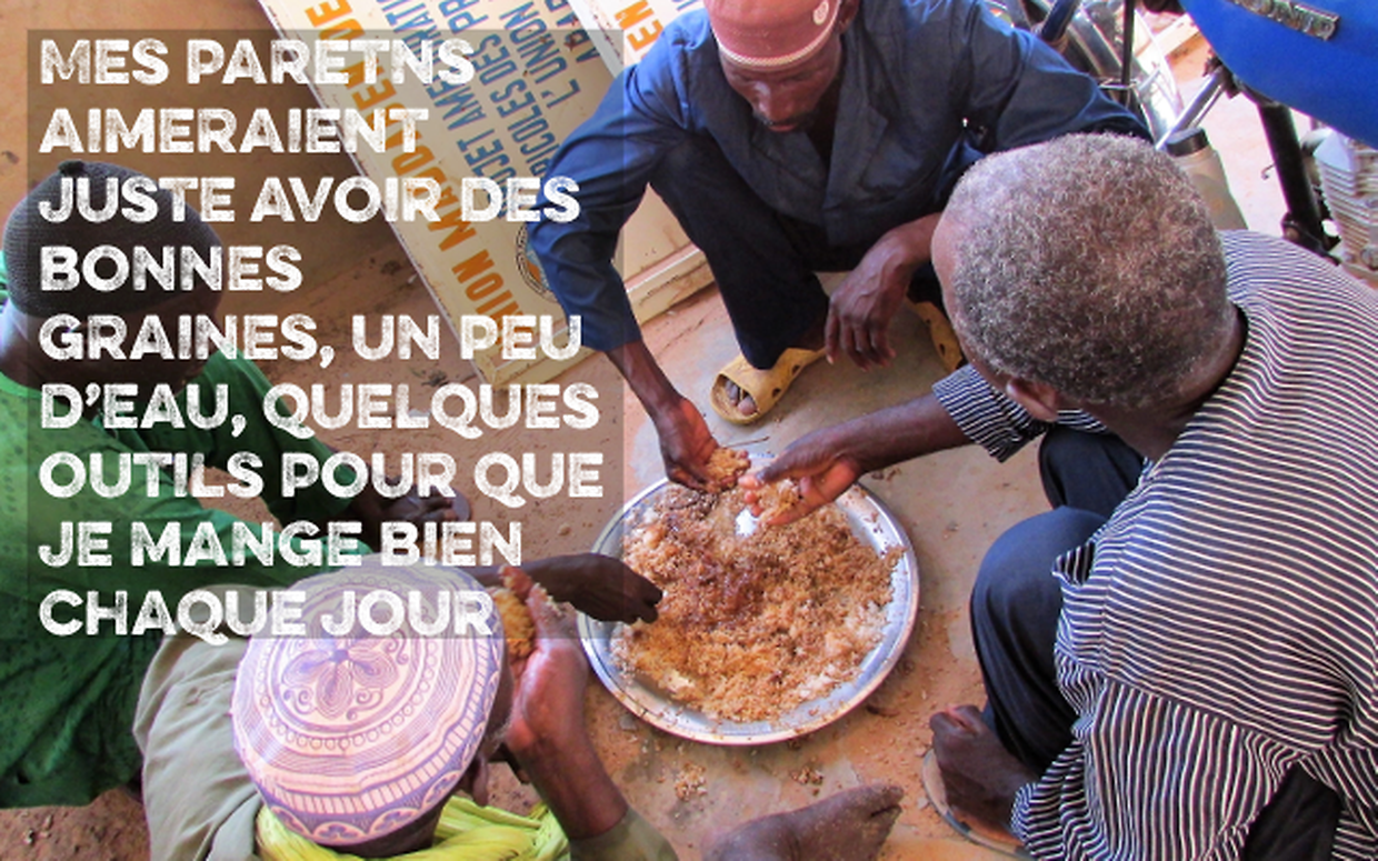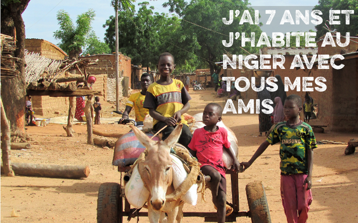 Bonjour. Je m'appelle Issa. J'ai 7 ans et j'habite au Niger avec tous mes amis. Mon papa et ma maman sont agriculteurs. Nous mangeons du riz, du niébé, des tomates, du poulet, plein de bonnes choses ! Mais pas tous les jours, ils aimeraient juste avoir des bonnes graines, un peu d'eau, quelques outils pour que je mange bien chaque jour. Comme ça, je serai fort et j'arriverai à mieux suivre à l'école. Et mes parents seront contents ! Pouvez-vous nous aider ? Merci.
