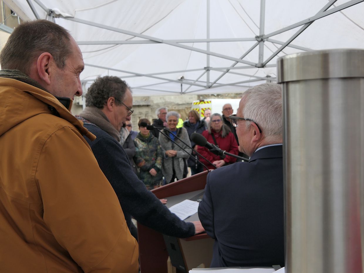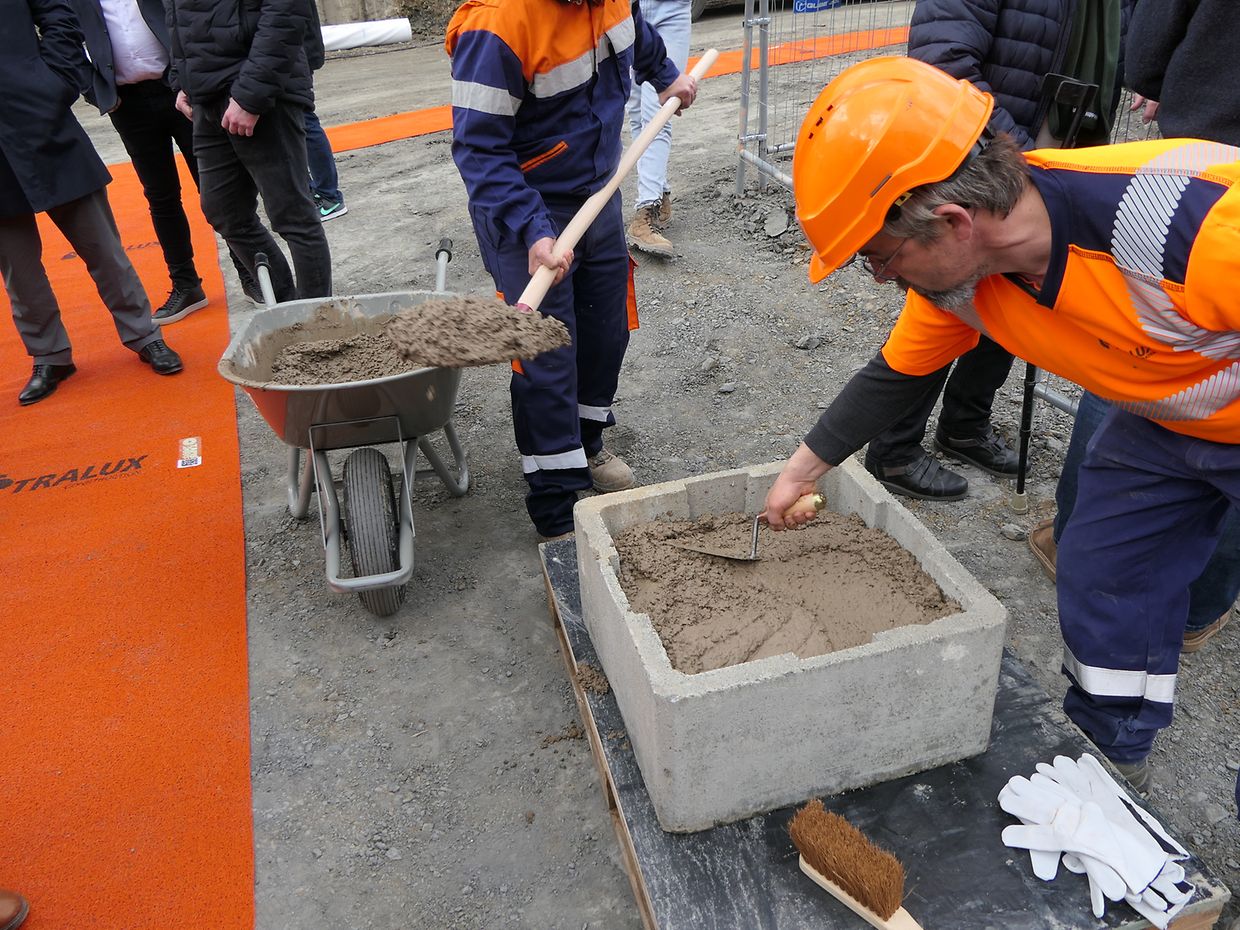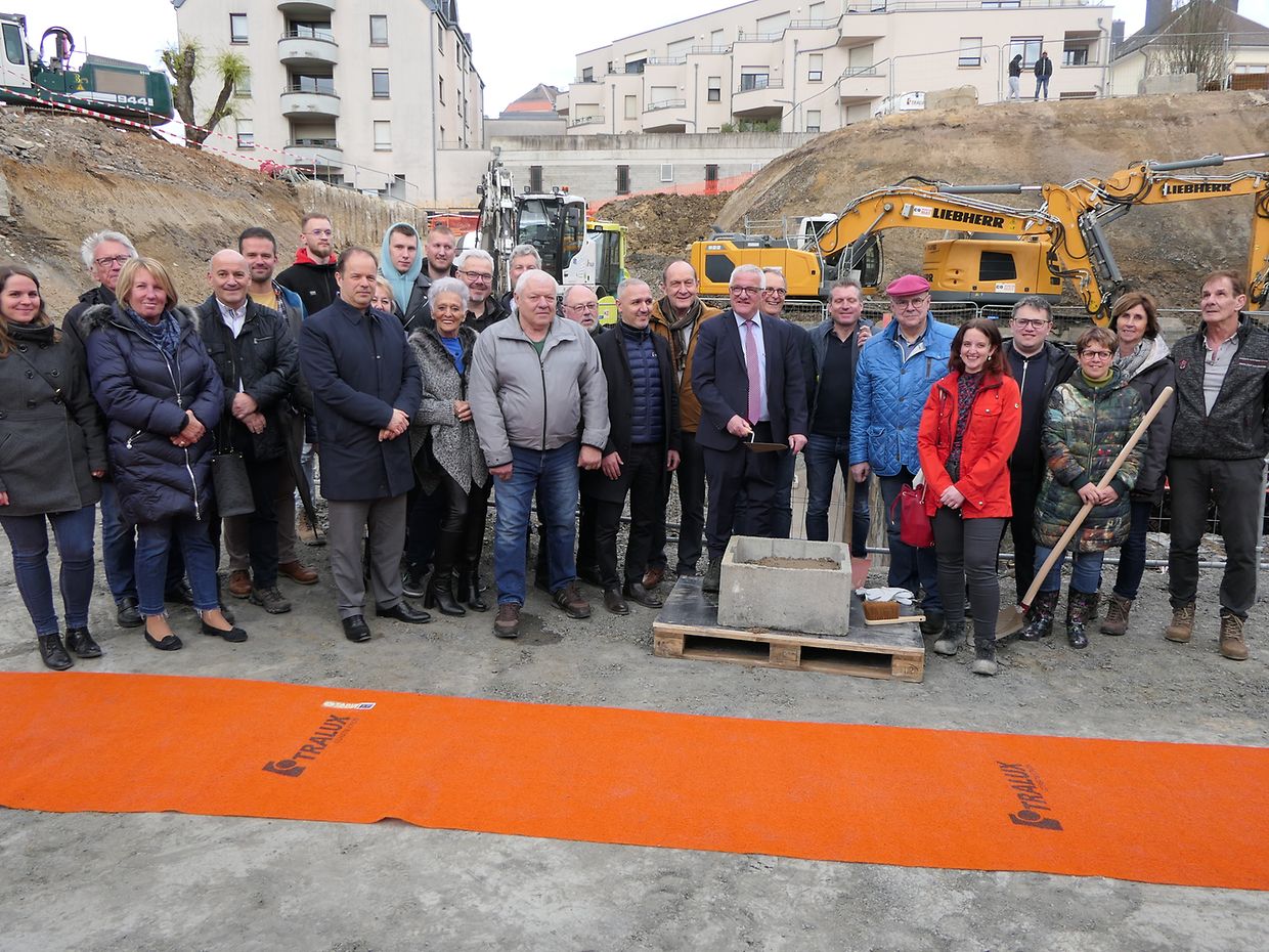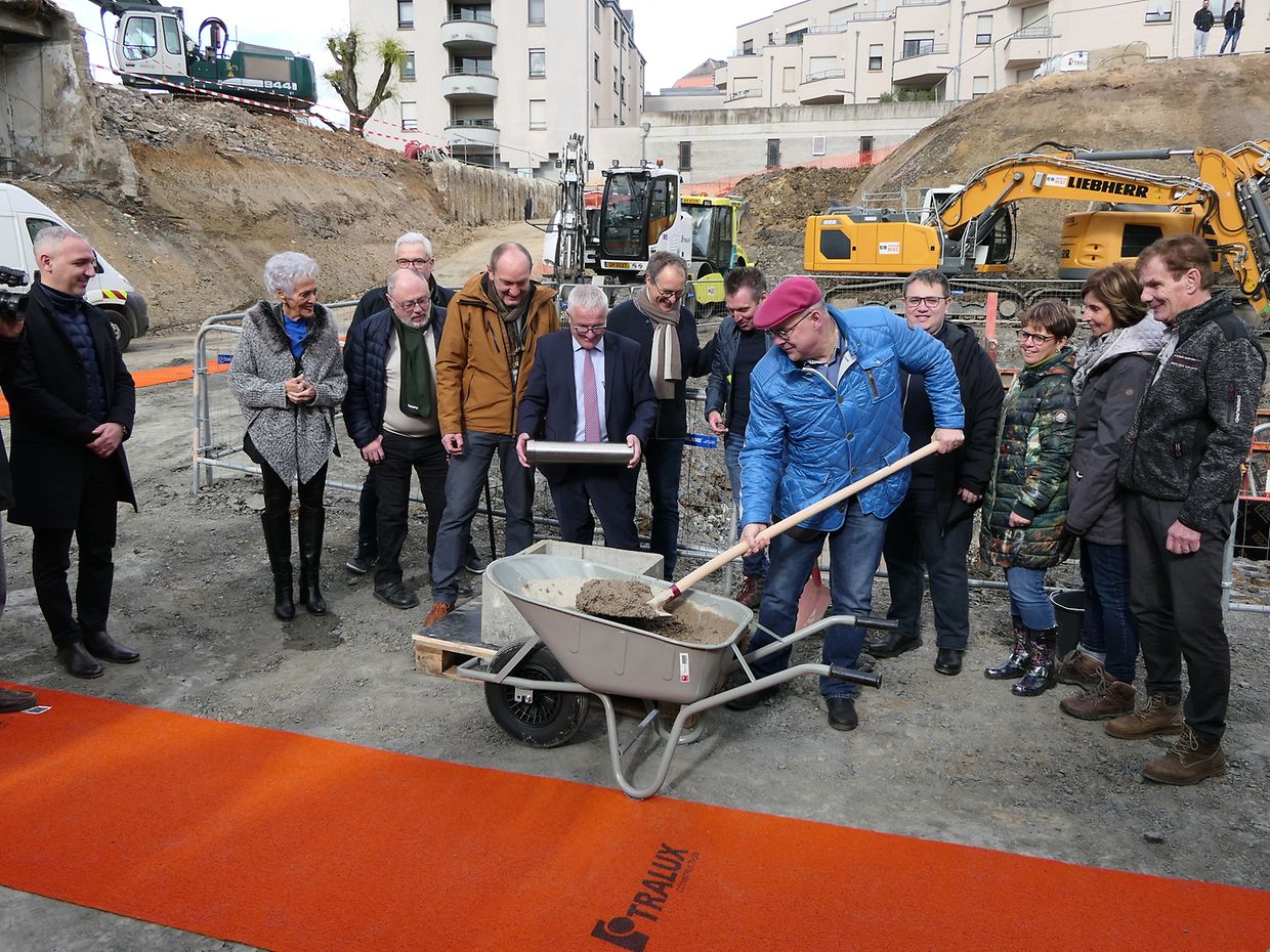 E Freideg, de 14. Abrëll 2023 huet dofir de Schäffen- a Gemengerot zesumme mat de Bauleiter, de Projetsbedeelegten an den Awunnner, déi ronderëm de Chantier wunnen, de Grondsteen geluecht.