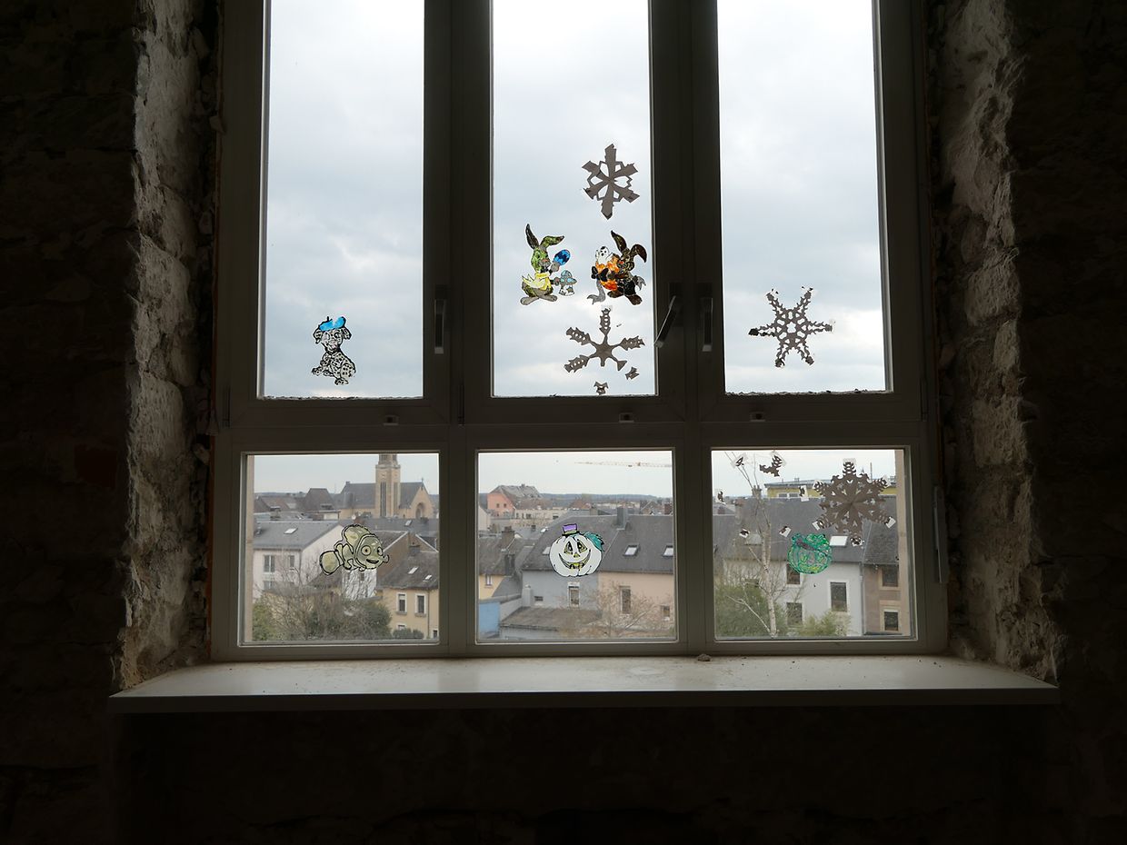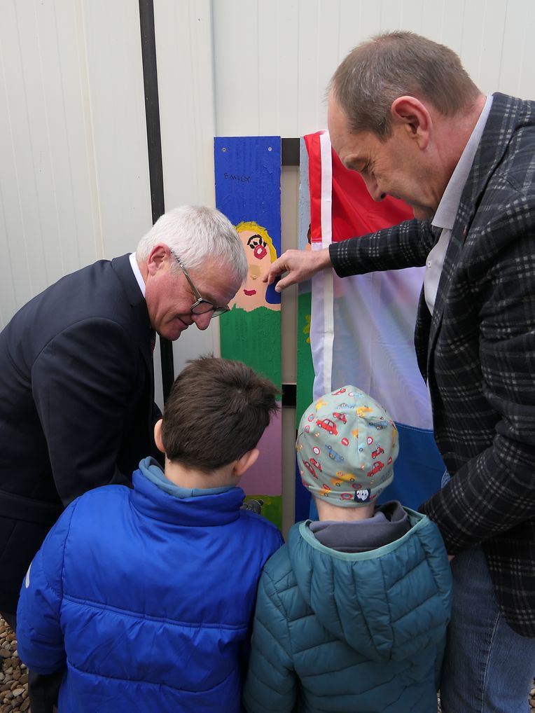 Dono ass et dunn an d’Rue du Parc gaangen, wou den temporäre Modulbau fir d’Bëschspillschoul offiziell mat authenteschem Gesang ageweit gouf. De Kanner hir Konschtwierker aus Holz, déi schonn am Viraus preparéiert goufen, sinn devoiléiert ginn a verschéineren elo d’Struktur, an där si säit November 2022 Cours hunn.