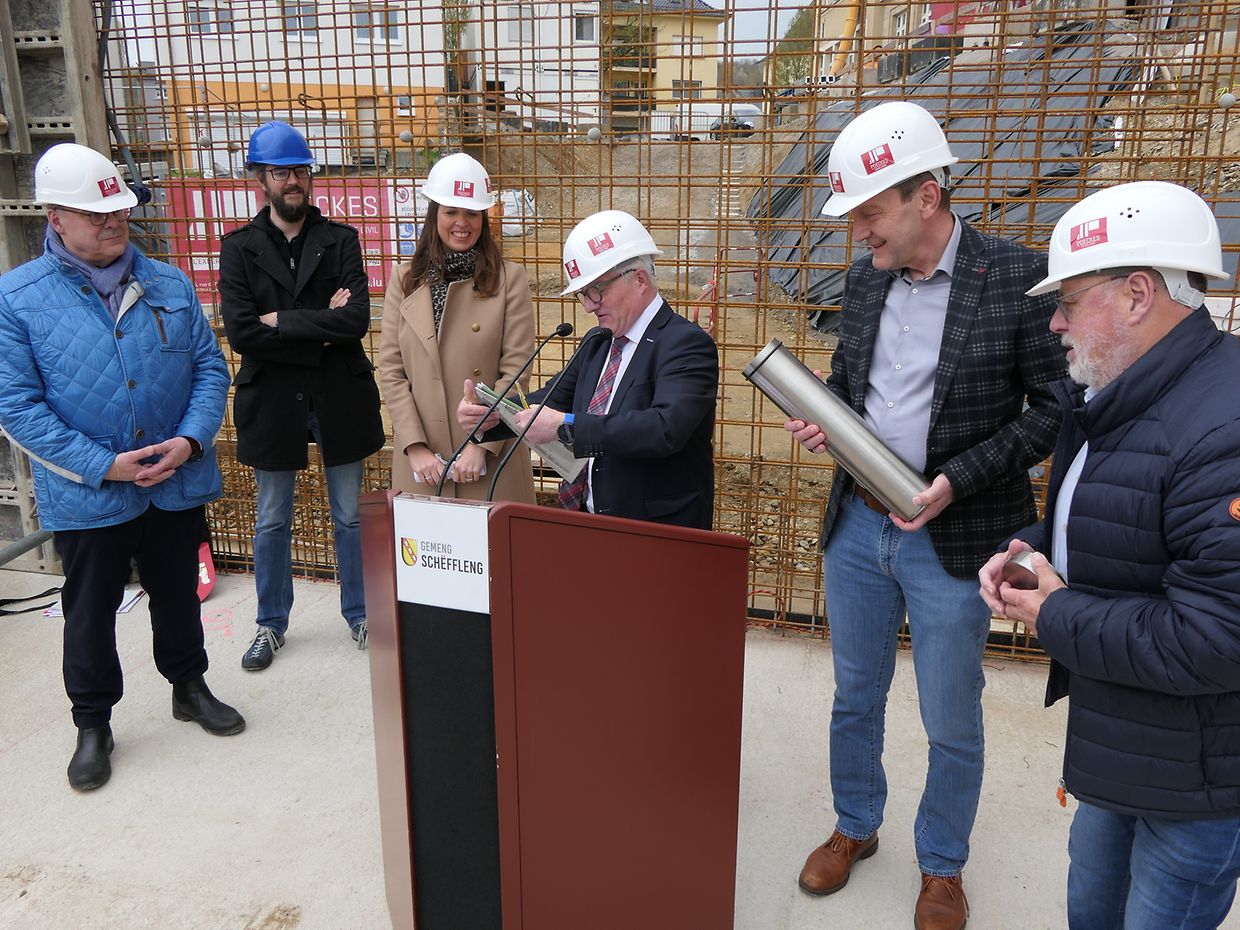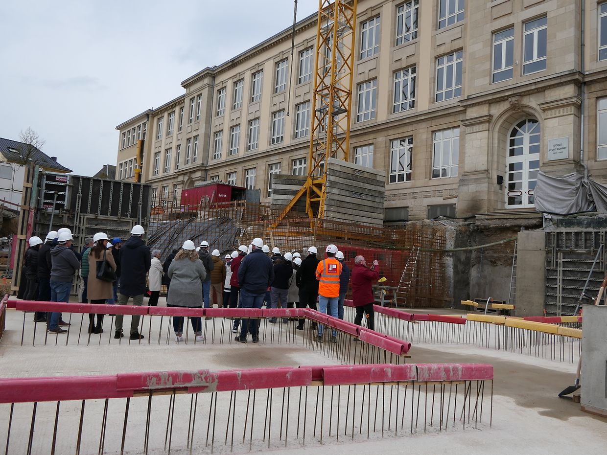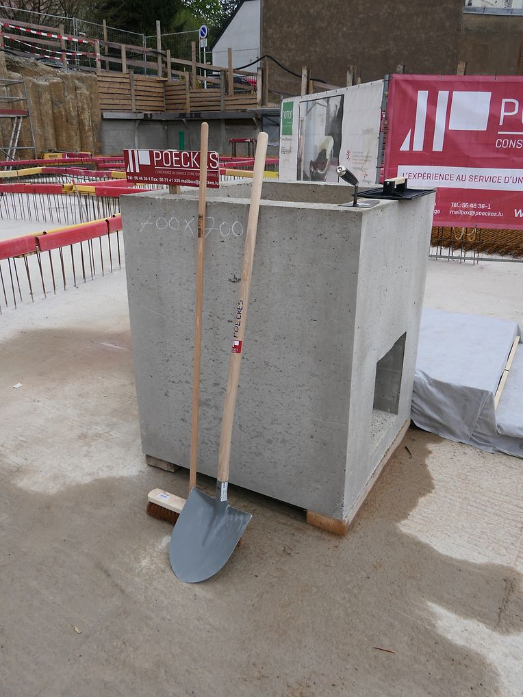 Zesumme mat de Baubedeelegten an dem Schoulpersonal huet de Schäffen- a Gemengerot de Grondstee vun der Annexe vun der Lydie Schmit Schoul geluecht. An eng selwergemaachen Zäitkapsel goufe personaliséiert Schoulgadgeten, zwou lëtzebuerger Dageszeitungen an d’Deliberatioun vum approuvéierte Projet veréiwegt an dës ass dunn (gutt gefëllt) abetonnéiert ginn. Uschléissend hunn d’Participante sech den impressionante Chantier bannen a baussen ugekuckt a kruten Erklärungen zum Stand der Dinge.