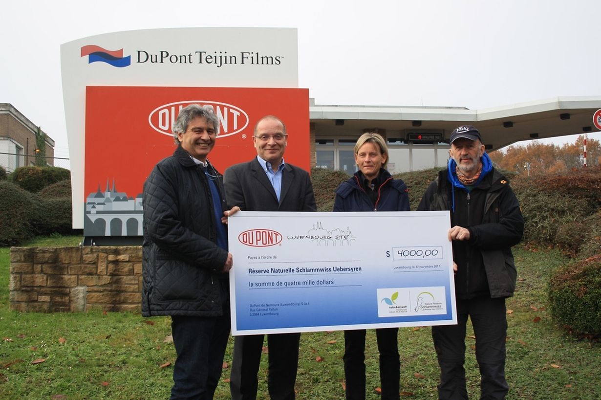 Le 17 novembre, à Contern, DuPont de Nemours Sàrl, représenté par le directeur du site, MonsieurMeyers, remet un chèque de quatre mille dollars (+/- 3384€) à natur&ëmwelt Fondation Hëllef fir d'Natur en faveur de la réserve naturelle Schlammwiss.