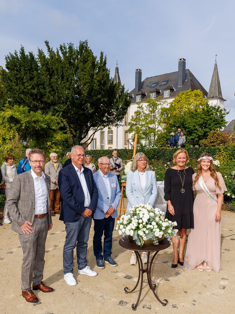 Unter den Taufgästen war auch die Bad Mondorfer Rosenkönigin Céline Wagner, die sich wie die zahlreichen Gäste über die tolle Atmosphäre im wunderschönen Rosengarten und Park von Schloss Munsbach freute. Hier gab es anlässlich des Rosenfests am Infostand der Lëtzebuerger Rousefrënn und bei handverlesenen Ausstellern Fachinfos, Tipps und Qualitätsprodukte aus erster Hand: Ob Rosen, Gartenpflanzen, Accessoires, Rosenkosmetik und Seifen, Geschenkartikel oder luxemburgische Qualitätsprodukte. Auch die Kutschfahrten des gemeinnützigen Vereins „De Leederwon“, meterhohen farbenfrohen Blütenfiguren des Stelzentheaters Circolo und Moderator Roland Girres sorgten für einen erlebnisreiches Rosenfest.