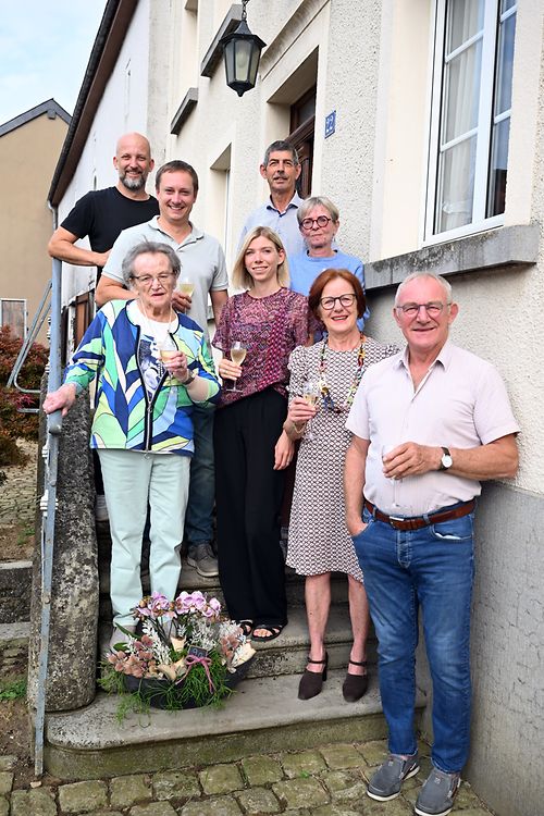 Schweech: Viru kuurzem konnt d’Marie- Jeanne Risch- Grein vu Schweech bei gudder Gesondheet, hiren 90. Gebuertsdag , Doheem feieren. Marie- Jeanne Grein ass den 26. August 1935, als dat jéngst vun dräi Meedercher vum Julien Grein, Mëller op der Platinerie zu Bonnert (B) an Marie- Anne Cler vu Béiwen/Attert op d’Welt komm. No der Primärschoul zu Tountel huet d’Gebuertsdagskand, wéi dat deemols üblich war, am Pensionat zu Virton hier Schoul fäerdeg gemach. De 4. Mäerz 1957, op Fuesméindig, gëtt d’Jubilarin mam Raoul Risch vu Schweech bestued. Di zwee, mat Leiw a Séil, Bauer, iwerhuelen dann och den elterlichen Bauerebtriib zu Schweech. Aus hirem Bestiednis gin e Meedchen an e Jong ervier. Haut ass d’Madame Risch- Grein mat grousser Freed, Groussmamm vun zwee Enkel an enger Urenkelin. E groussen Aschnëtt an hirem Liewen war den Doud vun hirem Mann Raoul, am Joer 2001. Arens Jeanny, wéi d’Jubilarin am Duerf genannt gëtt, wunnt haut nach zu Schweech an hält sech um Lafendem wat am Bauerebetrib geschitt oder wat esou am Duerf lass ass. An hirem aktive Liewen waren di zwee gesellig Leit a si vill eraus gaang. Och haut geet si nach gären ënnert d’Leit an ass bei all Familjefeier gaeren derbéi. Besonnesch huet si sech gefreet iwer de Besuch vum Buergermeeschter Thierry Lagoda mat sengem Schëffen Claude Loutsch, déi mat engem schéinen Blummenarrangement an petits- fours komm waren, fir d’Gléckwënsch am Numm vun der Gemeng Biekerich un d’Jubilarin zu hirem 90. Gebuertsdag ze iwerbréngen. Duerno ass d’Glas zesummen mat der Famill erhuewe gin an op weider gesond, glécklich an zefridden Joeren geprost gin. (CR) (Foto: Charles Reiser)