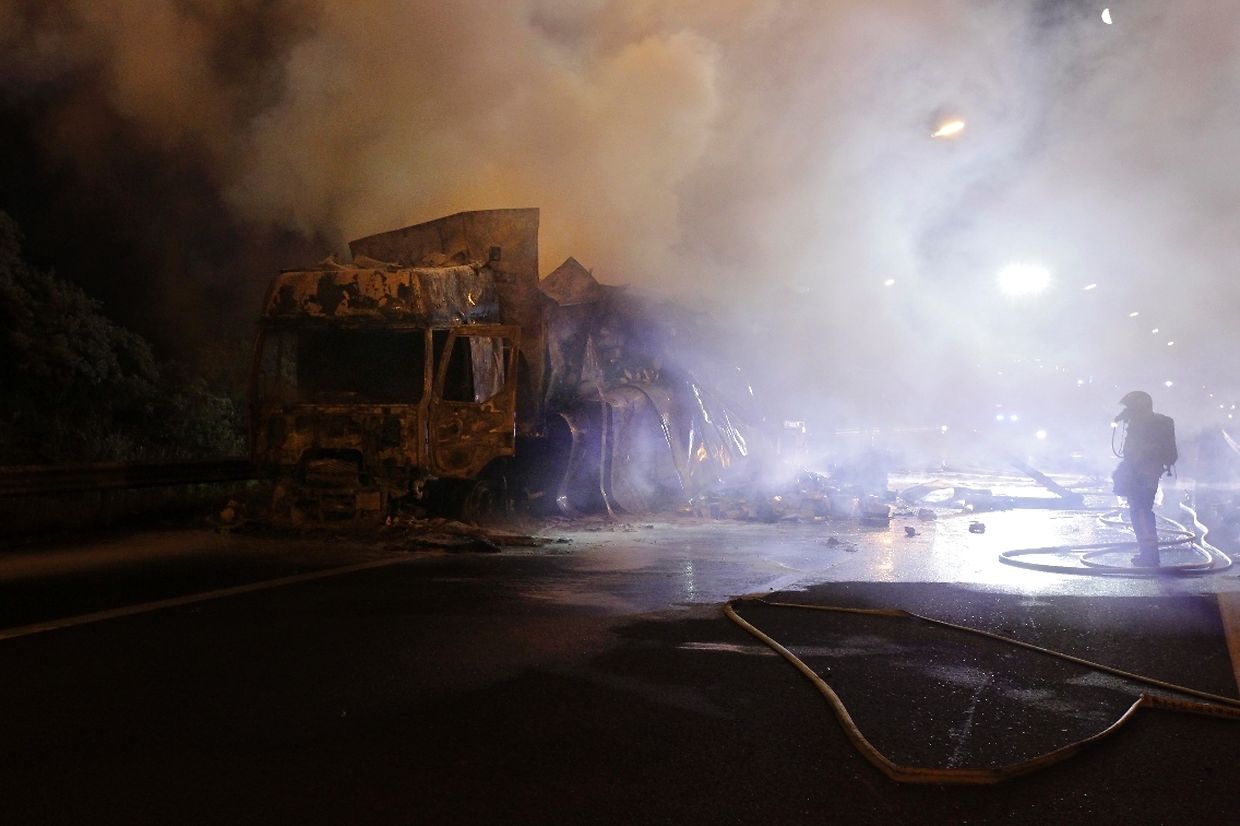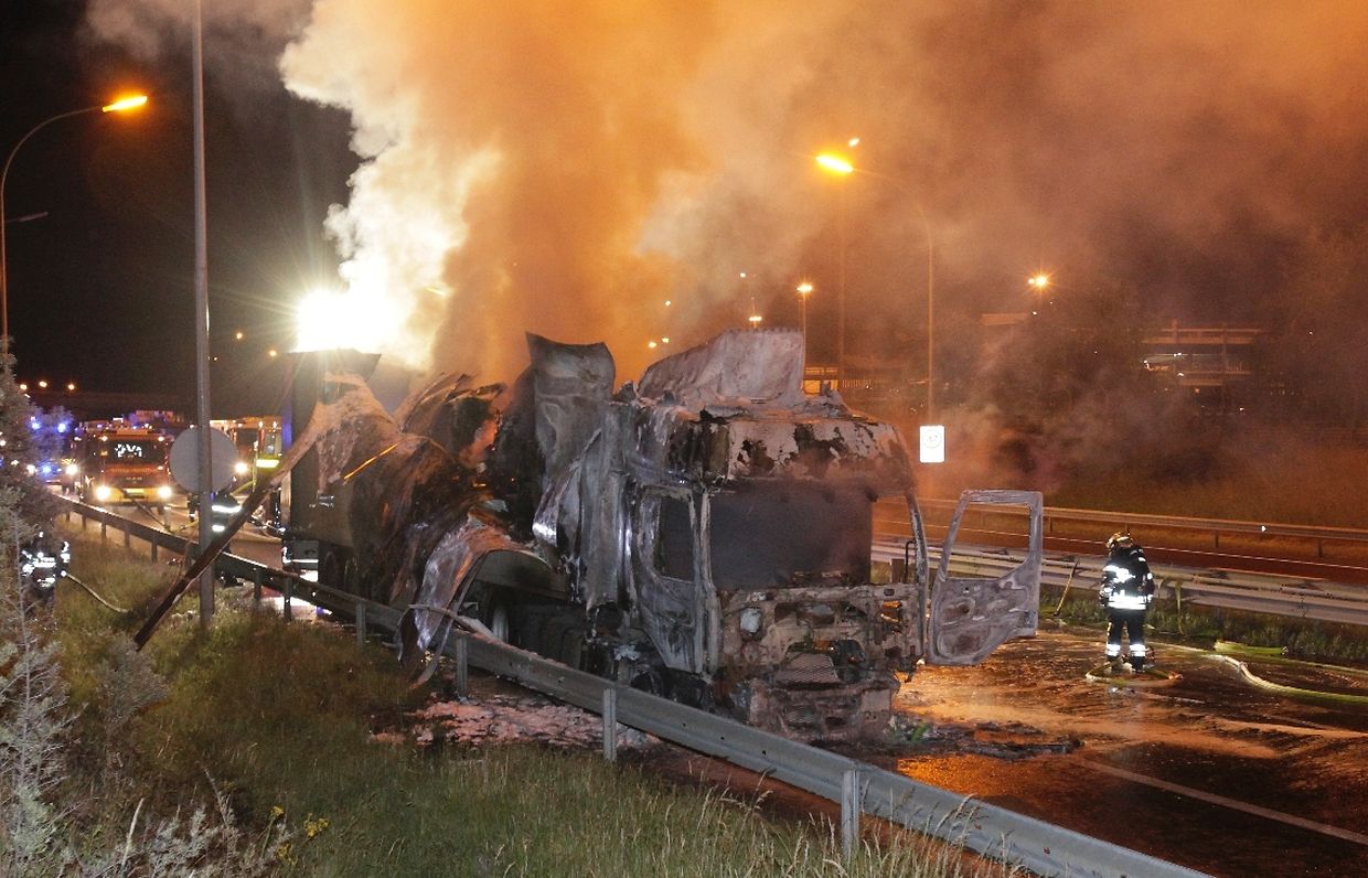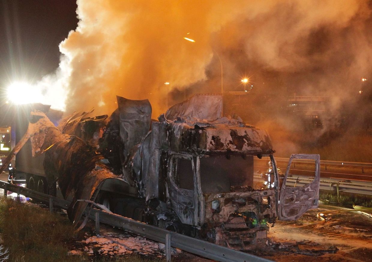 Angaben der Polizei zufolge hatte der Fahrer Brandgeruch in der Kabine und Rauch auf der rechten Fahrzeugseite bemerkt. Es brannte zwischen der Zugmaschine und dem Anhänger. Der Versuch, mit einem Handfeuerlöscher das Feuer einzudämmen war vergeblich. Die Flammen griffen rasch auf den Aufleger über und das ganze Gespann stand binnen Minuten komplett in Flammen.