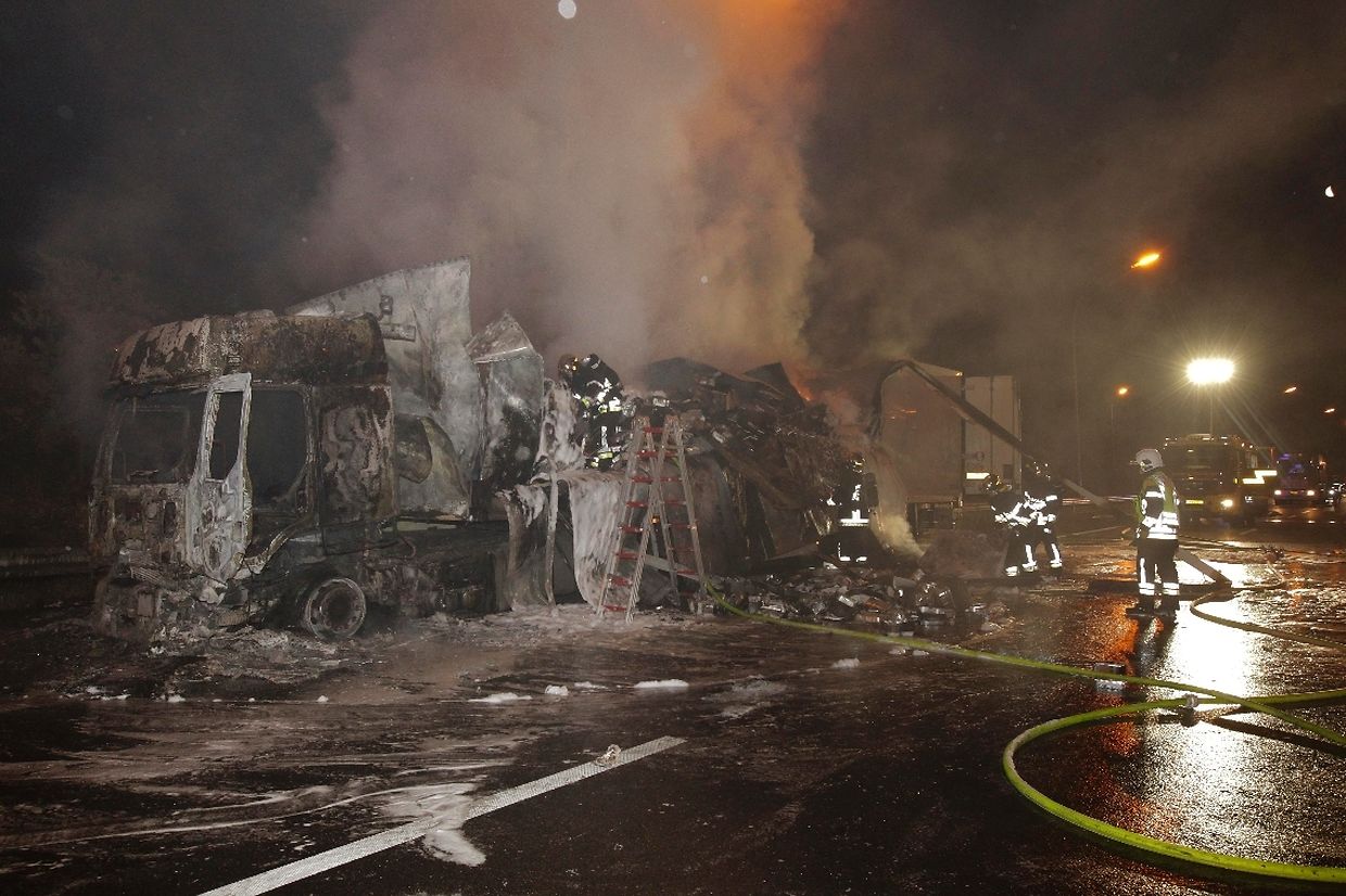 Kurz nach 2.30 Uhr war in Höhe des Cargocenters ein Lastwagen in Brand geraten. Die Löscharbeiten erweisen sich als schwierig - auch kurz vor 6 Uhr war das Feuer noch nicht ganz gelöscht.