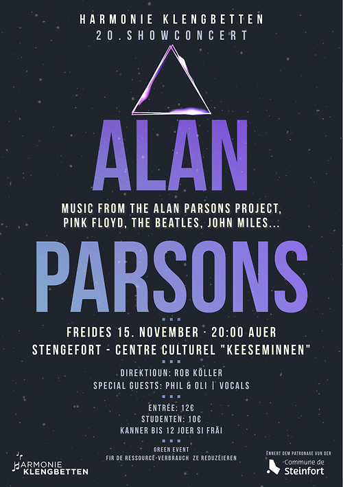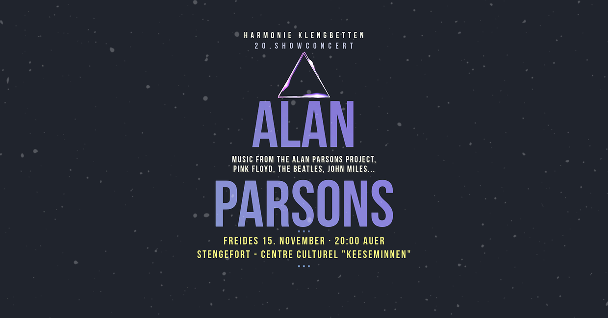 D’Harmonie Klengbetten invitéiert iech op hiren 20. Show-Concert, deen dëst Joer ënnert dem Thema „Alan Parsons“ steet. Dëst de 15. November am Centre culturel „Keeseminnen“ zu Stengefort ënnert der Direktioun vum Rob Köller.
