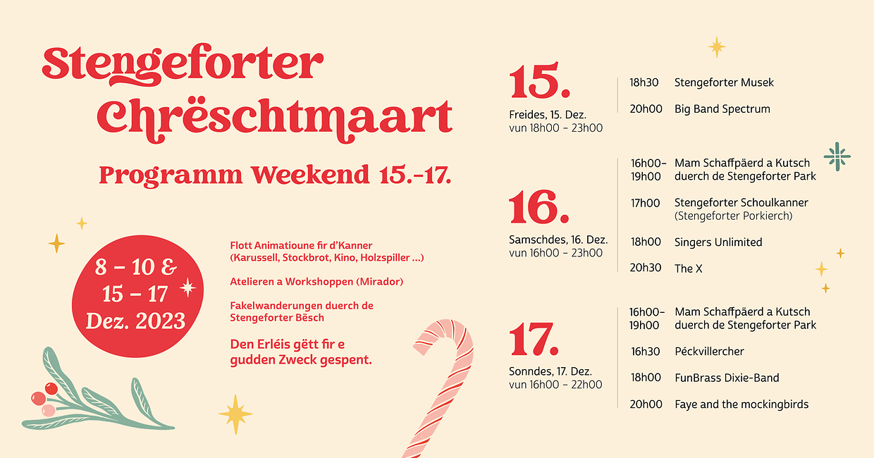 Der Weihnachtszauber erwartet Sie auch dieses Jahr wieder in Steinfort! Besuchen Sie uns, um die Weihnachtszeit zu feiern.