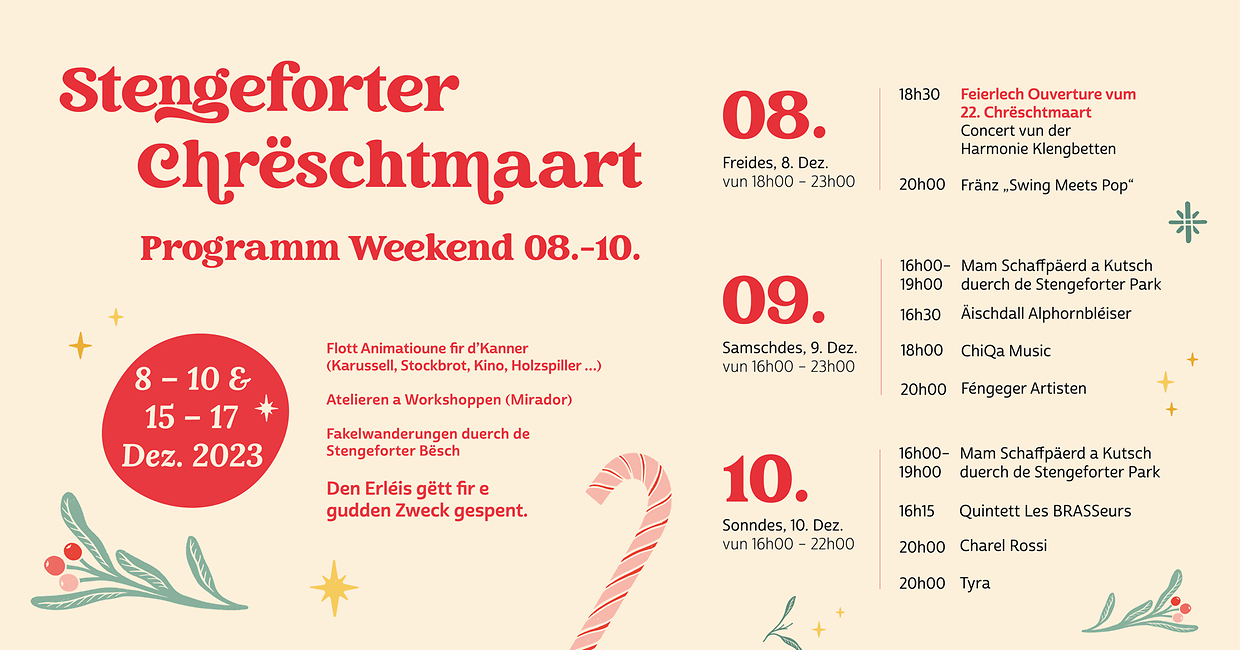 Ab Freitag, dem 8. Dezember 2023, wird der Zauber der Festtage wieder lebendig, wenn der mit Spannung erwartete 22. Steinforter Weihnachtsmarkt seine Pforten öffnet. Diese symbolträchtige Veranstaltung findet wie gewohnt am zweiten und dritten Dezemberwochenende im Herzen von Steinfort statt, im malerischen Park zwischen dem Rathaus und der Villa Collart.