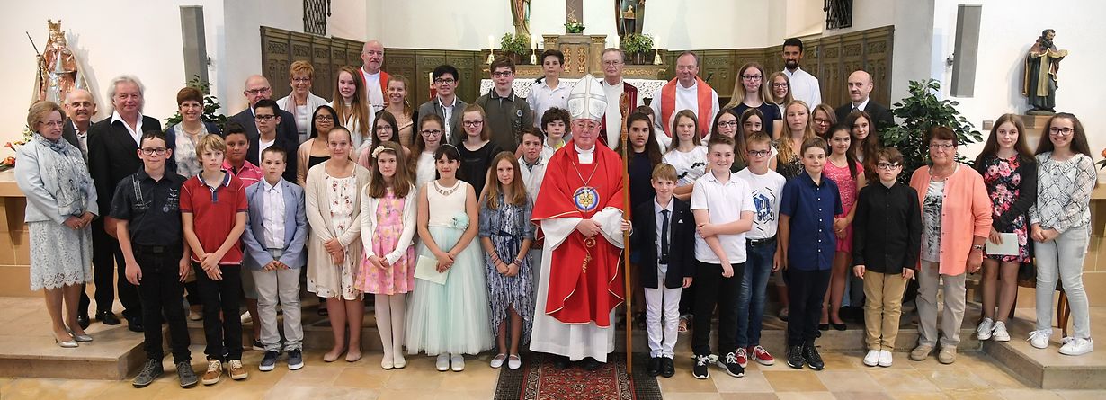 Im Rahmen eines feierlichen Gottesdienstes unter dem Motto „Avance au large“ spendete Erzbischof Jean-Claude Hollerich 31 Jugendlichen der Pfarrei „Äischdall“, von Eischen und Hobscheid sowie 4 Jugendlichen der Firmgruppe von Bascharage in der Kirche von Hagen das Sakrament der Firmung. Einleitend hieß Camille Jacqué den Erzbischof willkommen und bedankte sich für sein Kommen. Am Altar standen dem Erzbischof die Geistlichen Nico Turmes, Theo Klein und Romain Gillen zur Seite. Die Firmlinge waren von den Religionslehrern und Ehrenamtlichen der Pfarrei auf diese Feier vorbereitet worden. Auf dem Programm standen u.a. ein Besuch im Institut St.Joseph in Betzdorf, in der Synagoge in Luxemburg, die Teilnahme am Pélé des Jeunes, Rallye rundum Rentert in Eischen und ein Vorbereitungsmorgen in Clairefontaine. Der feierliche Gottesdienst wurde von den Chören aus Steinfort und Hagen-Kleinbettingen unter der Leitung von Camille Houllard, begleitet an der Orgel von André Scheuer, gestaltet . Als Andenken an ihre Firmung wurden die Jugendlichen von ihren Paten und Patinnen Jacoby-Thillges Denise, Jacoby Aloyse (Hagen-Kleinbettingen), Susy und Roland Linster (Steinfort), Ginette Arendt-Drouet, Weber Raymond (Eischen-Hobscheid), Kemp-Cloos Claudine, Alphonse Simon (Koerich)) mit einer Bibel bedacht. Im Anschluss an die Feier in der Kirche begrüsste Bürgermeister Jean-Marie Wirth den Erzbischof und alle Gäste bei einem Empfang der Gemeinde Steinfort im „Pompjeessall“ in Hagen.(FOTO: CHARLES REISER)