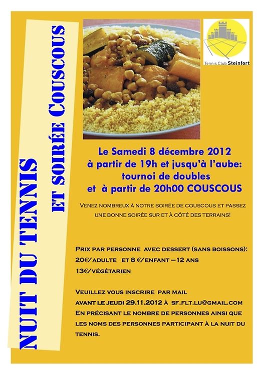 Si vous voulez combiner le plaisir de jouer au tennis avec une soirée COUSCOUS, vous êtes à la bonne adresse au TC Steinfort.