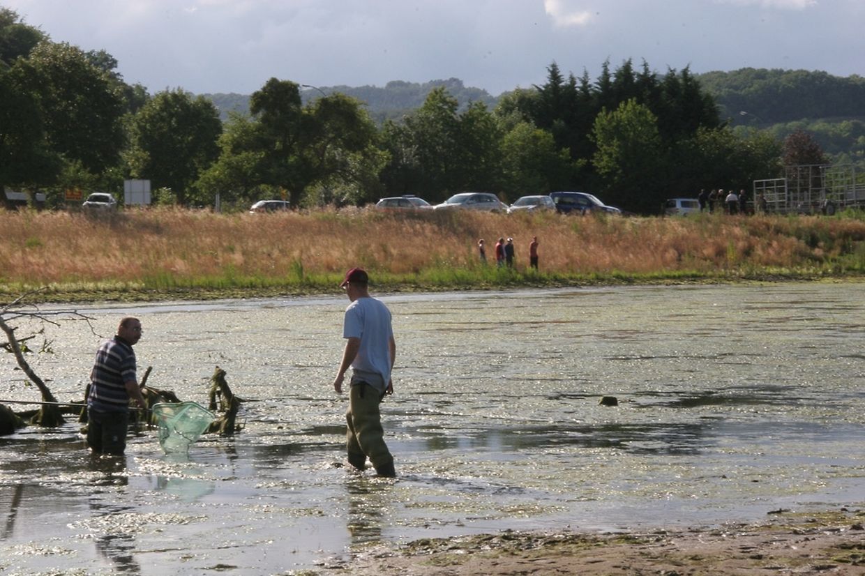 So errichtete man ein Wehr im Handbetrieb und hielt das Wasser mehr oder weniger zurück. Im Einlauf setzte man eine Feuerwehrpumpe und sorgte so für die Frischwasserzufuhr. Allerdings machten beide Beamte des P&Ch gegen 18 Uhr pünktlich Feierabend, nicht ohne zuvor die Pumpe abzustellen. Da bereits zu diesem Zeitpunkt jede Menge Fische vor Ort auf dem Trockenen lagen, hatte dies zahlreiche Angler alarmiert und auch der Präsident der FLPS Jos Scheuer war vor Ort.