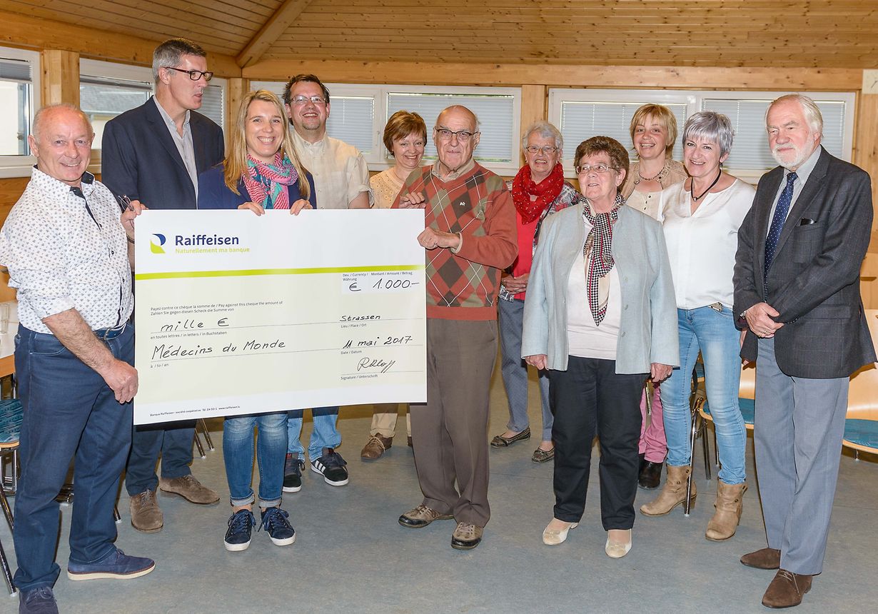 D'Chorale Ste Cecile vu Stroossen hat Vertrieder vun der Organisatioun Médecins du Monde an hiere Proufsall invitéiert fir hinnen e Chèque iwwer 1000 € ze iwereechen. D'Mme Sylvie Martin, Directrice an den Dr Jean Bottu, President vu Médecins du Monde hu bei där Gelegenheet hier nei Brochure presentéiert an hunn aus dem Alldag vu Médecins du Monde erzielt. D' Equipe vu Médecins du Monde bekëmmert sech bénévol em déi Mënschen aus eiser Gesellschaft déi keen Zougang zur Krankeversecherung hunn an dofir oft keng medezinesch Hëllef an Usproch huelen. Et war en intereressant Diskussiounsthema.D' Mme Martin an den Dr Bottu hunn der Chorale villmols Merci gesot, si sinn op Spenden ugewiesen a fréen sech dofir iwwer all finanziell Hëllef. D'Chorale ass frou e klenge Beitrag geleescht ze hunn fir deenen mannerbemëttelte Mënschen ze hëllefen.