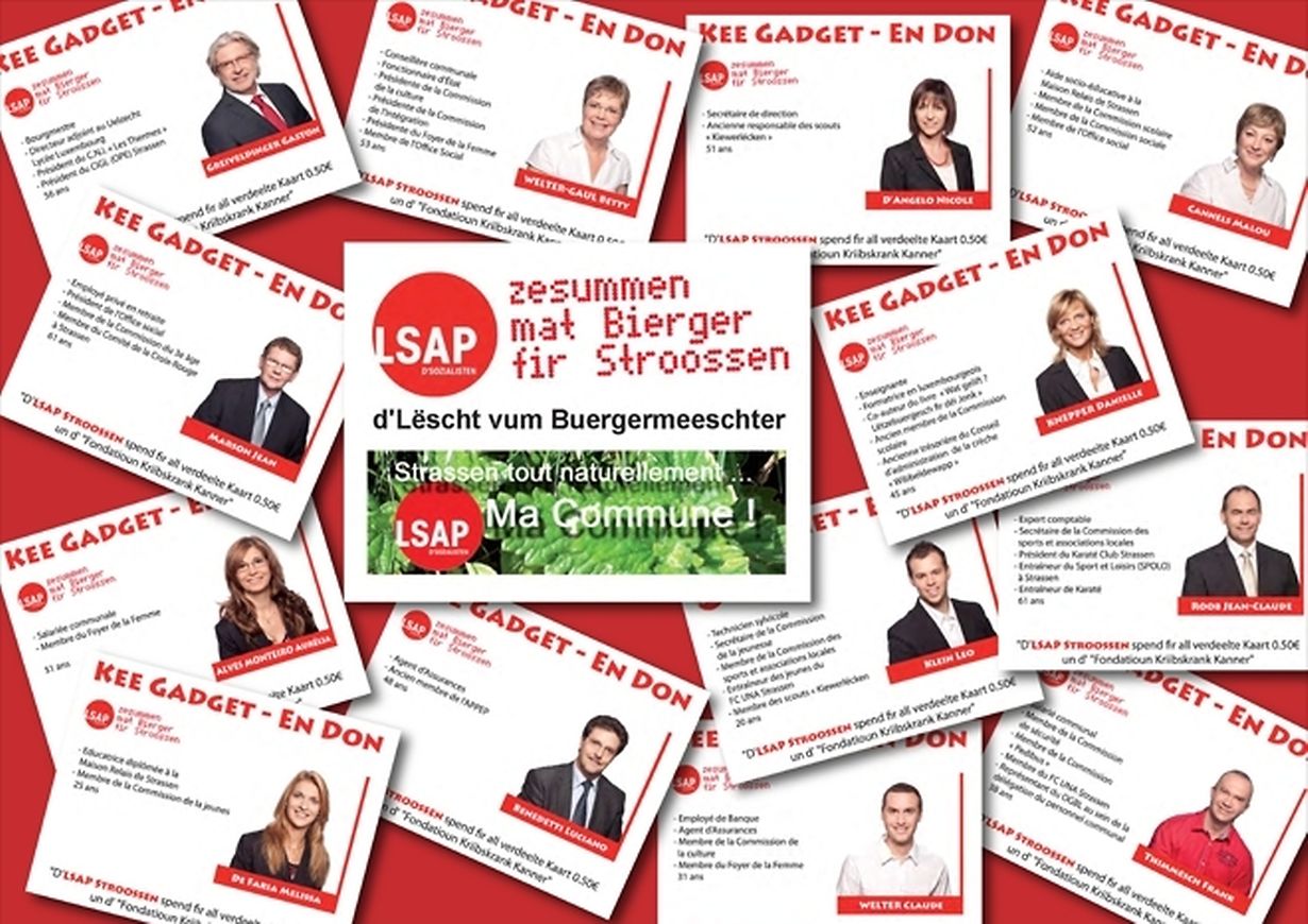 Die Kandidaten der „Lëscht 3, d’LSAP, zesumme mat Bierger fir Stroossen,“ möchten einen neuen Weg einschlagen, und desshalb haben sie unter anderem, gemeinsam vereinbart keine Gadgets zu verteilen, sondern Karten. Bei jeder verteilten Karte werden die Kandidaten 0,50 € der „Stiftung Kriibskrank Kanner“ spenden.