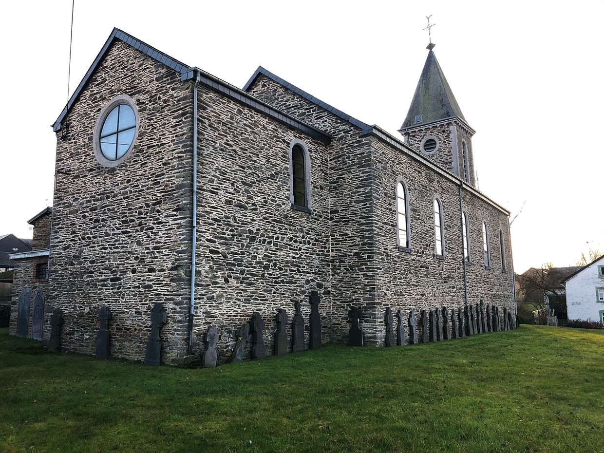 On peut encore admirer, sur les flancs de l’église, les pierres tombales, particulièrement ouvragées, de plusieurs prêtres et vicaires ayant desservi la paroisse. Le portail extérieur de la sacristie, daté de 1 739 et surmonté d’une petite niche destinée à recevoir la statue du saint patron, est une remarquable pièce de schiste ardoisier due aux artistes tyroliens de Recht.
