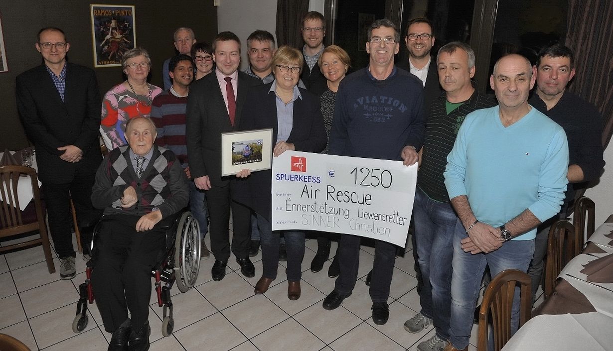 Useldingen: Christian Sinner aus Useldingen litt unter plötzlichen Atembeschwerden als er im Jahre 2007 auf Einkaufstour war. Nach einer kurzen Untersuchung im „centre médical“ in Redingen/ Attert kam der Arzt zum Entschluss dringend den Helikopter der „ Luxembourg Air Rescue“ anzufordern um sein Patient sofort ins Hospital nach Ettelbrück zu fliegen. Neulich hatte die Gemeindeverwaltung Useldingen zum Neujahrsempfang eingeladen wo Christian Sinner als langjähriger Gemeindearbeiter und später als Pförtner und seit dem 1. Januar 2016 als angehender Ruheständler einen Scheck über 925 Euro als Dank und Anerkennung in Empfang nehmen konnte. Kürzlich hatte Christian Sinner seine früheren Arbeitskameraden und Angestellte aus der Gemeindeverwaltung Useldingen ins Restaurant“ Um Wier“ eingeladen um dort offiziell Abschied zu feiern. Dabei nutze er die Gelegenheit der „ Luxembourg Air Rescue“ vertreten durch Josée Kridel, einen Scheck über 1 250 Euro zu überreichen als Zeichen der Anerkennung für den raschen Helikopter- Einsatz, dem er heute sein Leben zu verdanken habe. Josée Kridel bedankte sich herzlich bei Christian Sinner im Namen der Stiftung von „Air Rescue“ für diese noble Geste und erklärte dass diese Spende integral zur Anschaffung von medizinischen Geräten für Rettungseinsätze zur Geltung kommen werde. Abschließend bedankte sich Christian Sinner ebenfalls bei Ehrenbürgermeister Nic Anzia mit seinem Gemeinderat für seine Einstellung als Gemeindearbeiter im Jahre 1979 wo er dann während über 35 Jahren zum Wohl aller Mitbürger seinen Dienst verrichten konnte. (TEXT/FOTO: CHARLES REISER)