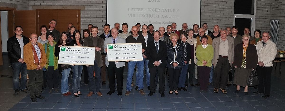 5 000 Euro entgegennehmen. Einen weiteren Scheck über 3 000 Euro konnte Marc Jans in Empfang nehmen, der der Vereinigung „ Comité National de Défense Sociale“ – „ CNDS- Naturaarbechten“ zugutekommen soll. Wie zu erfahren war, überreichte die Sektion Redingen/ Attert seit Bestehen nicht weniger als 75 000 Euro als Unterstützung für die Düdelinger Pflegestation. In ihren jeweiligen Ansprachen würdigten Jean Weiss, Vertreter des Verwaltungsrates der Liga und Bürgermeister Toni Rodesch die zahlreichen Aktivitäten der „ Natur- a Vulleschutzliga“ Sektion Kanton Redingen im Dienste von Natur und Umwelt, was großen Dank und Anerkennung verdiene. Der Vorstand setzt sich zur Zeit wie folgt zusammen: Dr. Marc Schmit ( Ehrenpräsident ), Jos Wampach,( Präsident ), Rudy Braun und Robert Thilmany ( Vizepräsidenten) Michèle Timmermann- Paler ( Sekretärin), Gérard Zoller ( Kassierer). Anny Braun- Kartheiser, Marc Feldtrauer, François Filbig, Gaston Fohl, Romain Gaspar, Roland Gereke, Romain Kleer, Christian Lavandier, Marco Pavani, Raymond Schannes und Ingrid Schannes- Hiery ( beisitzende Mitglieder).