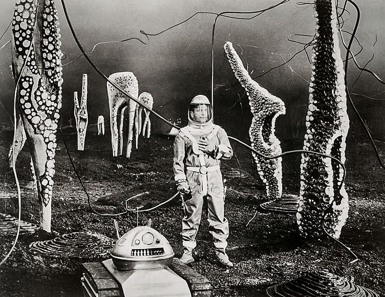 The amazing imaginative fiction author Stanislaw Lem wrote this visually stunning East German space exploration film with a dated but still thoughtful message. The Sets of Der Schweigende Stern are detailed and beautiful - giving the film an amazingly alien feel. The cinematography varies from excellent to mediocre, and the visual effects are cleverly done - relying on actual props and set devices as opposed to split screen and blue or green screen trick photography. Lem's plot is poignant and well-paced, but, unfortunately, most of the acting in this film is a bit difficult to watch. Finally, the overuse of voice-over narration in the early part of the film detracts from its otherwise good artistic and technical merit.