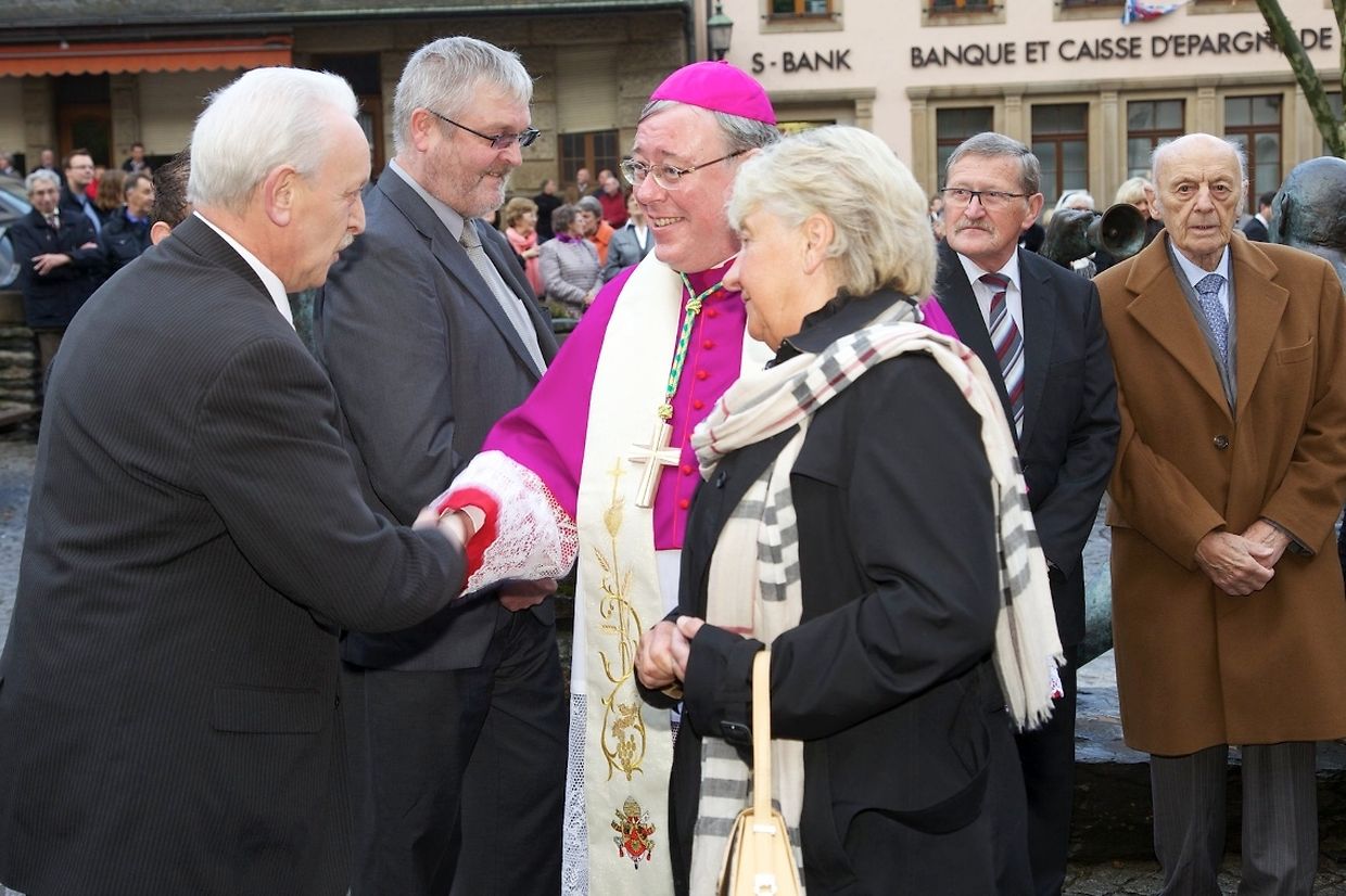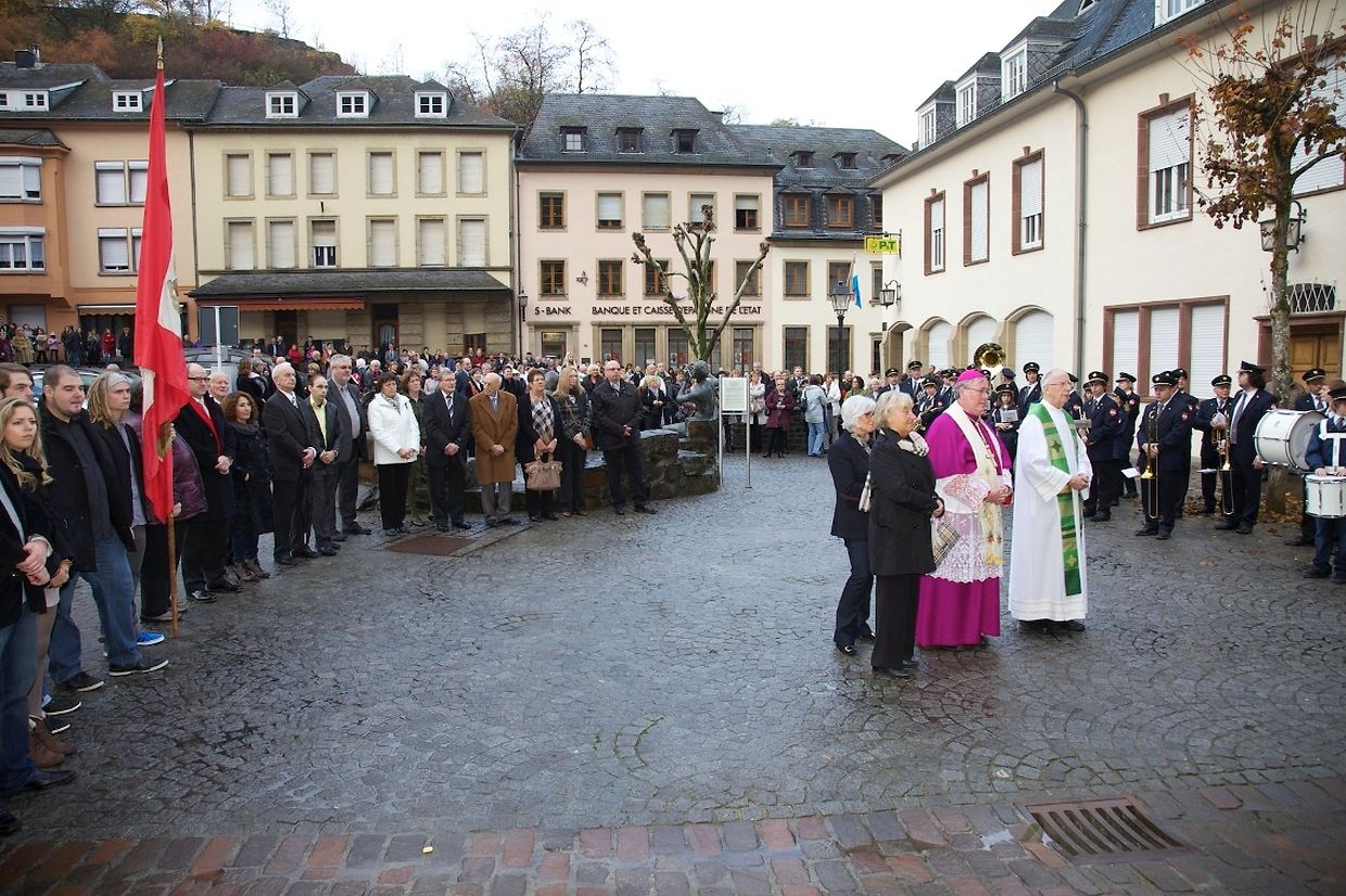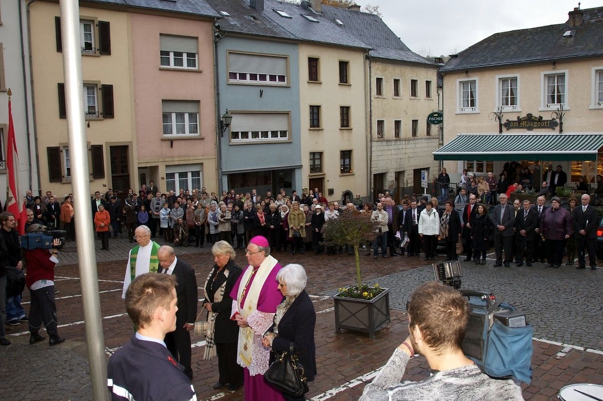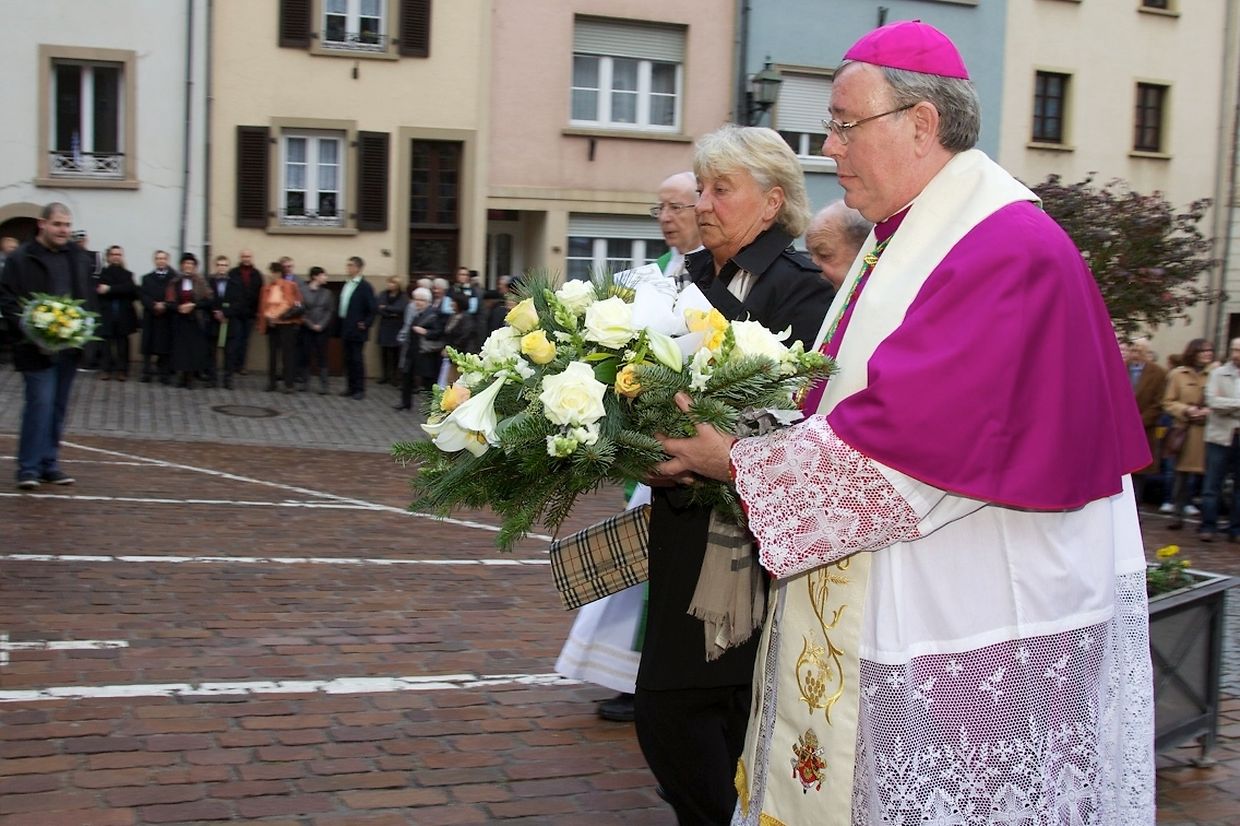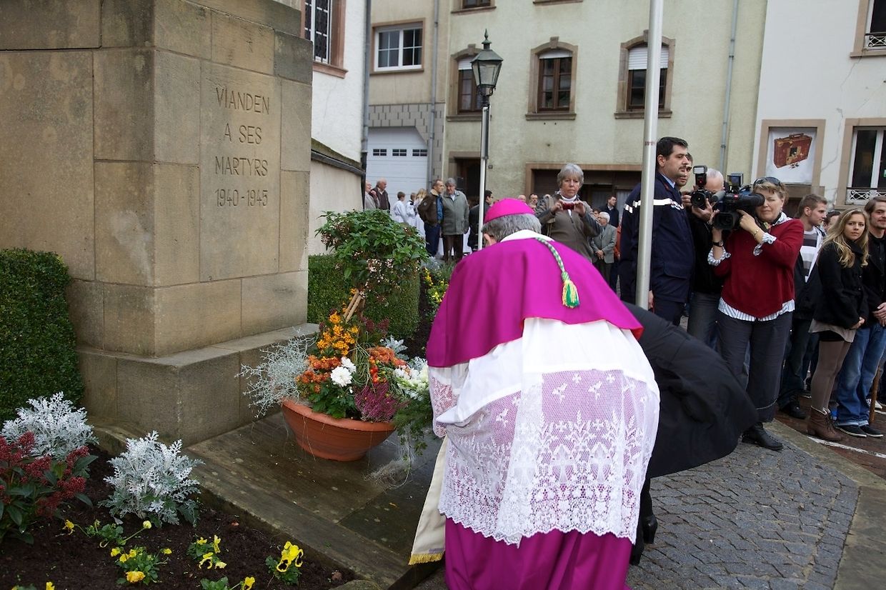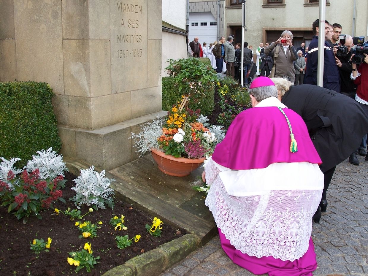 Nachdem ihm seitens der Messdiener ein Blumenstrauß überreicht worden war, wurde der Erzbischof unter den Klängen der „Veiner Stadmusik“ im Umzug zum „Monuments aux morts“ geleitet, wo er Blumen zum Gedenken niederlegte.