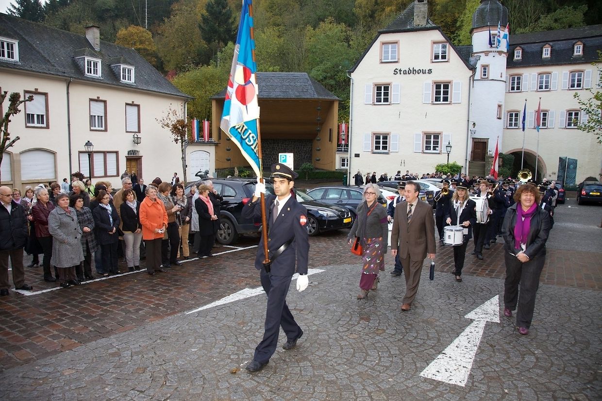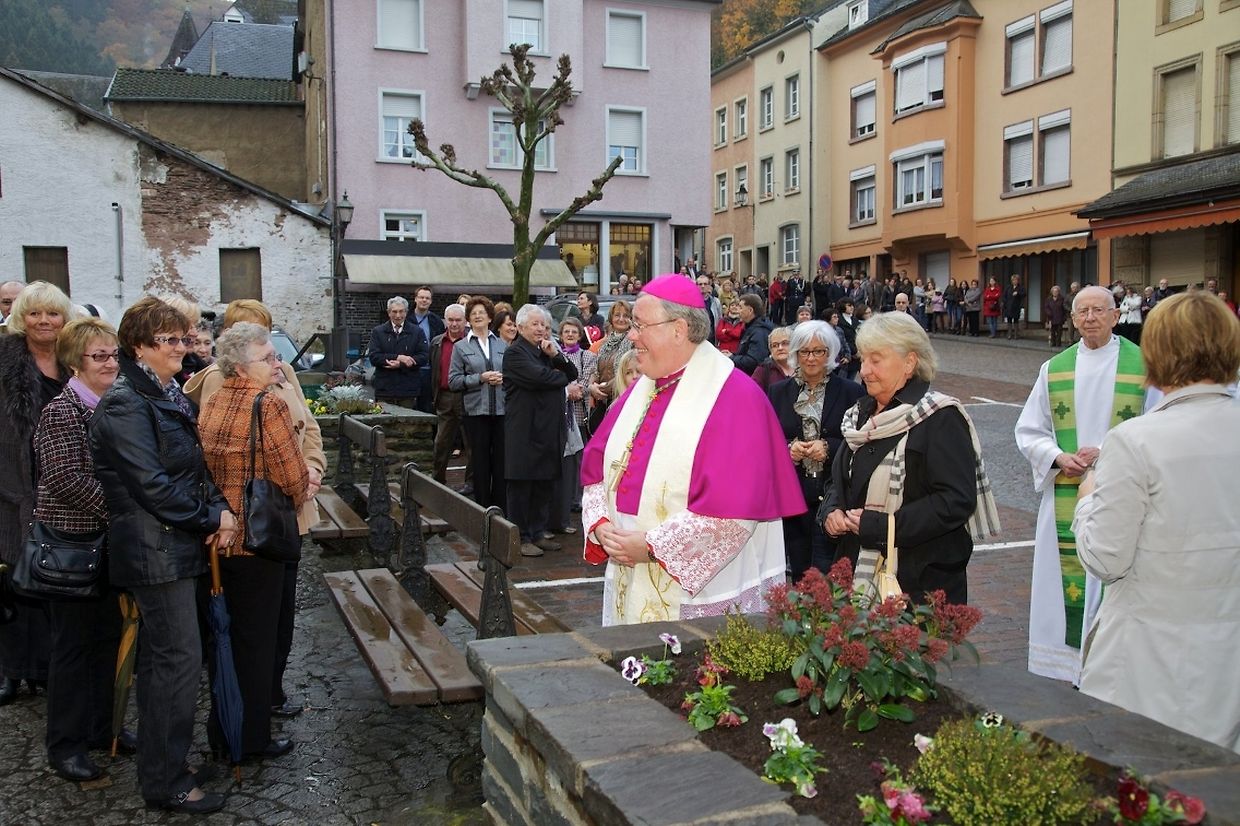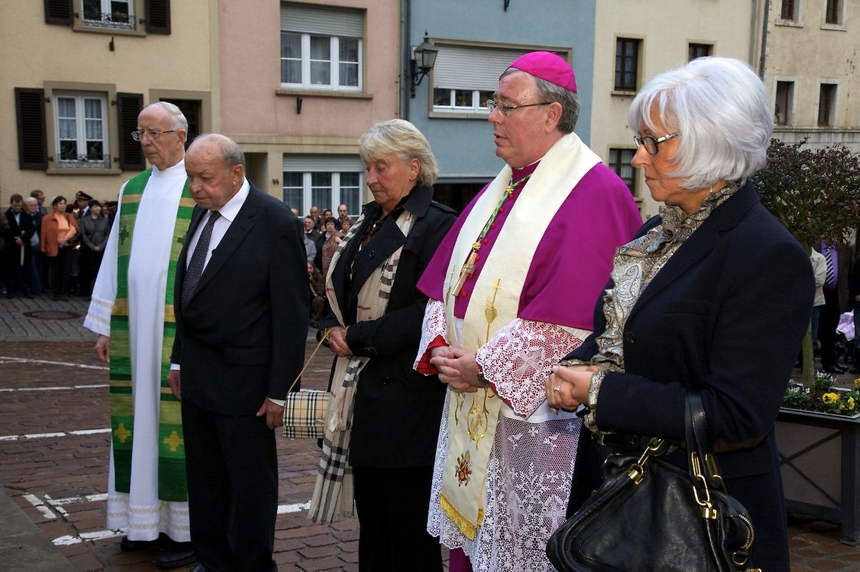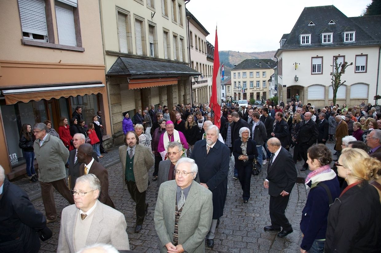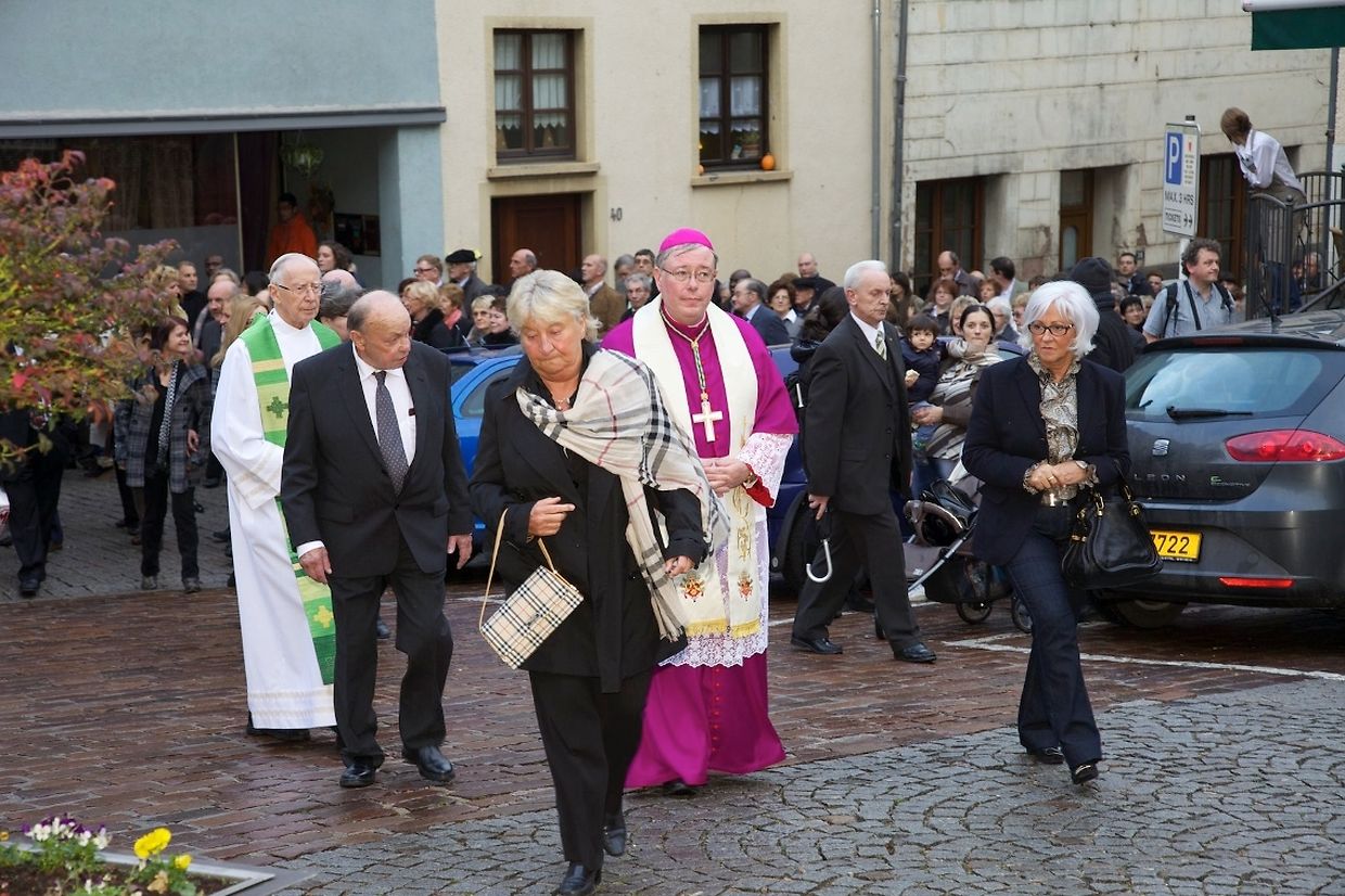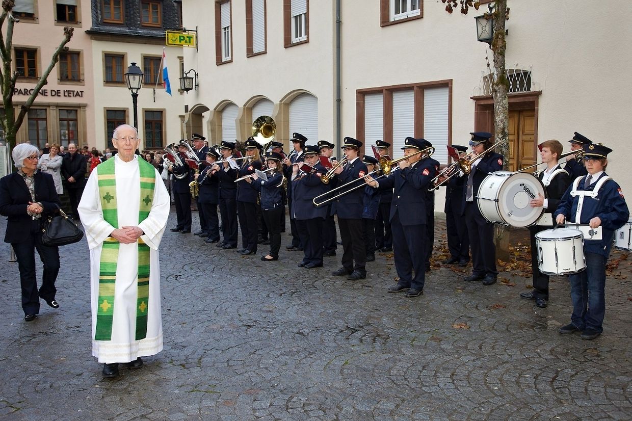 Nachdem ihm seitens der Messdiener ein Blumenstrauß überreicht worden war, wurde der Erzbischof unter den Klängen der „Veiner Stadmusik“ im Umzug zum „Monuments aux morts“ geleitet, wo er Blumen zum Gedenken niederlegte.