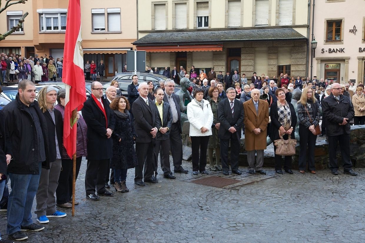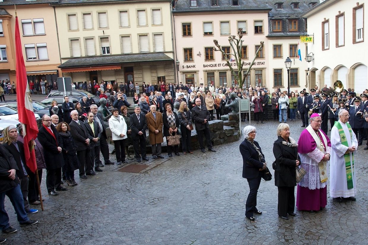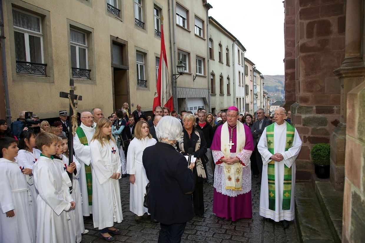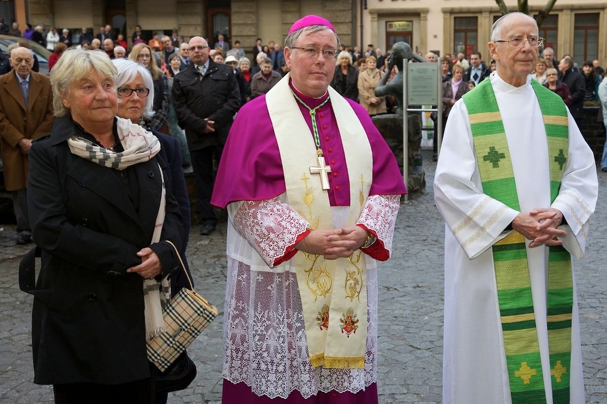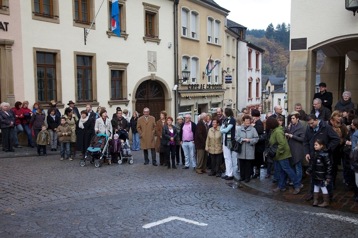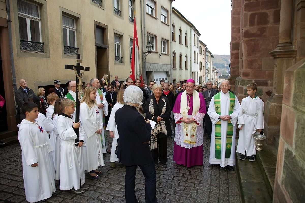 Nachdem ihm seitens der Messdiener ein Blumenstrauß überreicht worden war, wurde der Erzbischof unter den Klängen der „Veiner Stadmusik“ im Umzug zum „Monuments aux morts“ geleitet, wo er Blumen zum Gedenken niederlegte.