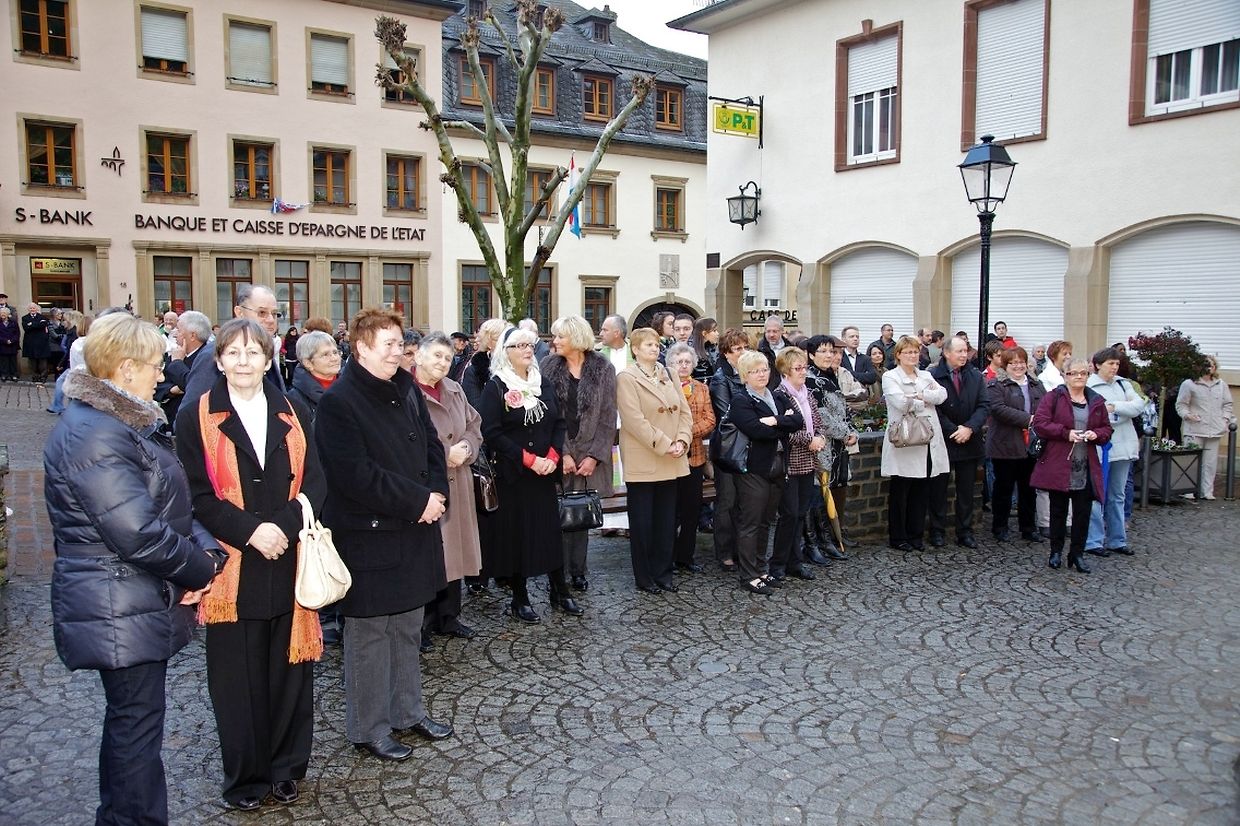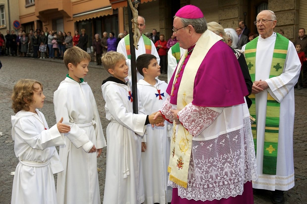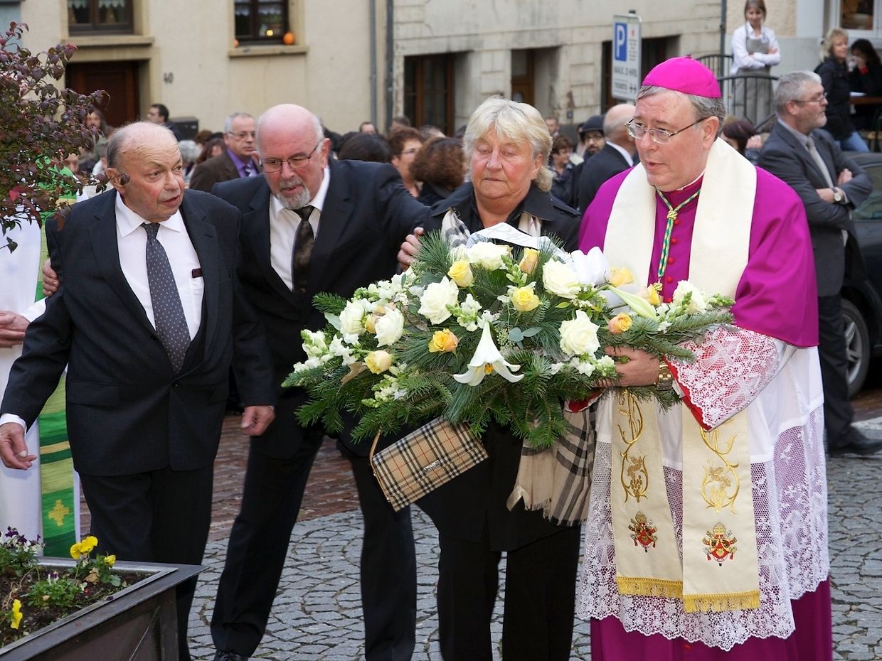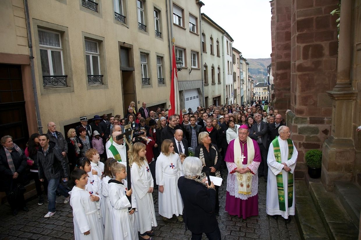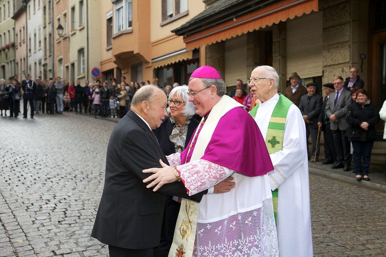 Nachdem ihm seitens der Messdiener ein Blumenstrauß überreicht worden war, wurde der Erzbischof unter den Klängen der „Veiner Stadmusik“ im Umzug zum „Monuments aux morts“ geleitet, wo er Blumen zum Gedenken niederlegte.