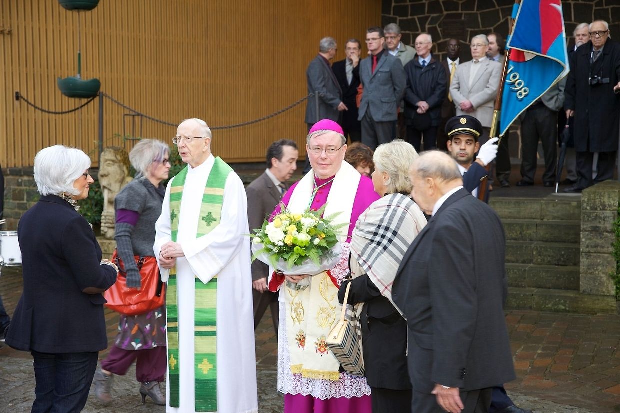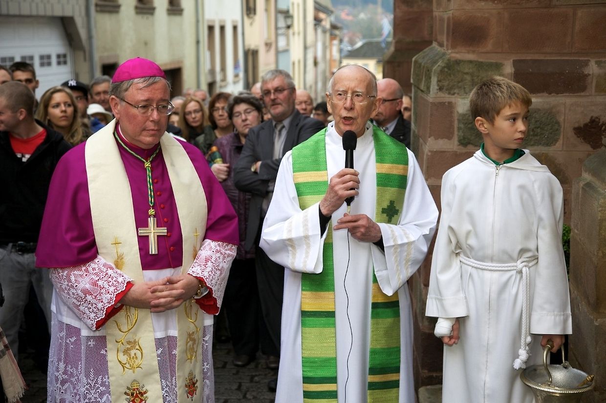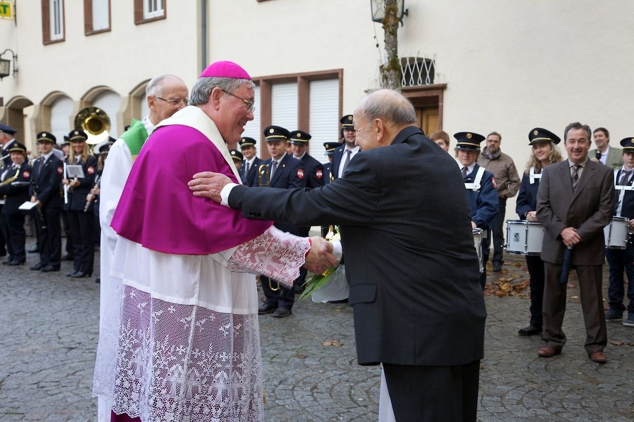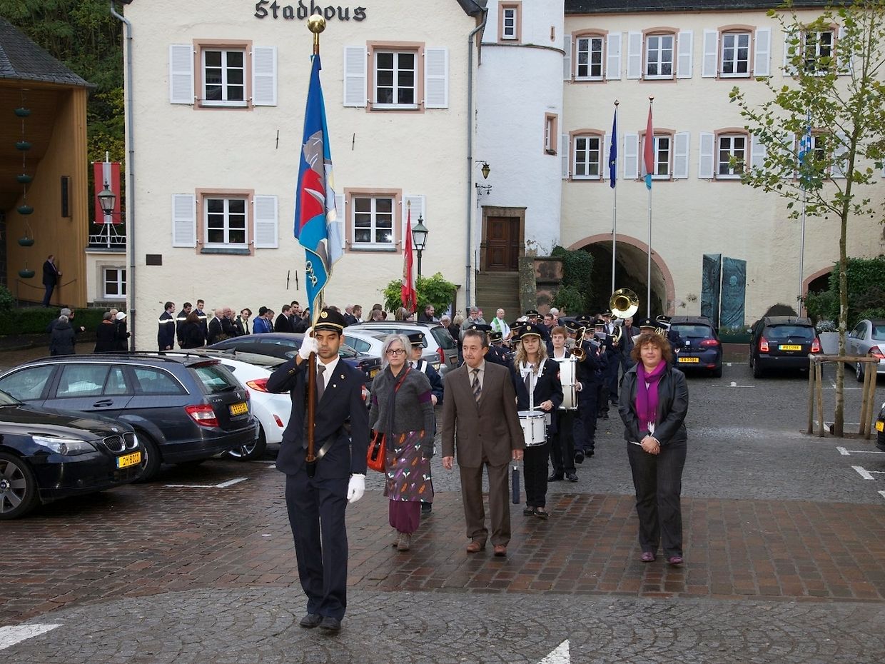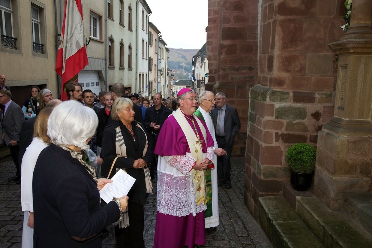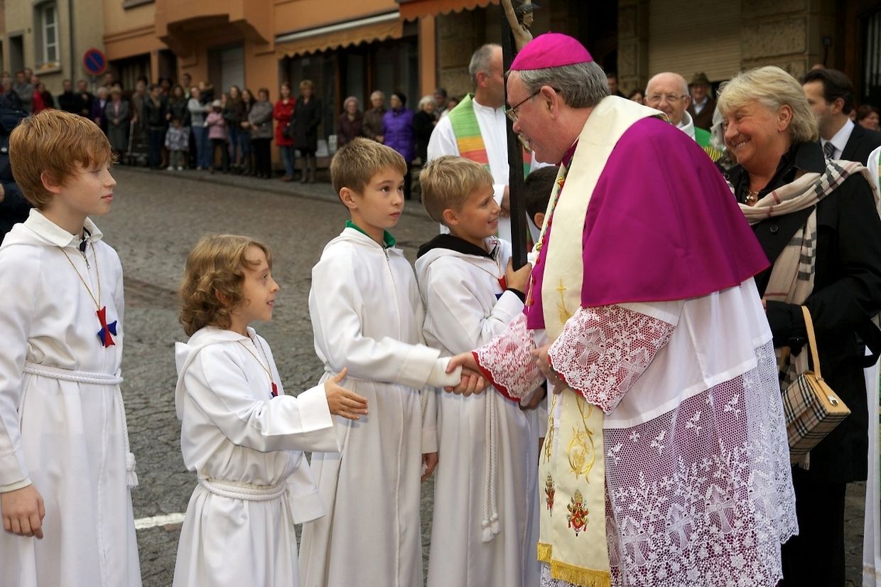 Nachdem ihm seitens der Messdiener ein Blumenstrauß überreicht worden war, wurde der Erzbischof unter den Klängen der „Veiner Stadmusik“ im Umzug zum „Monuments aux morts“ geleitet, wo er Blumen zum Gedenken niederlegte.