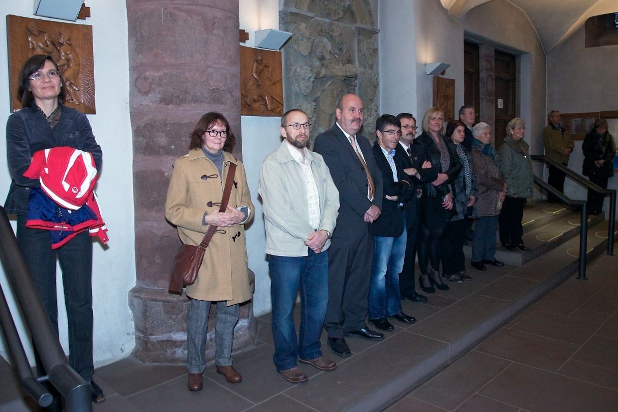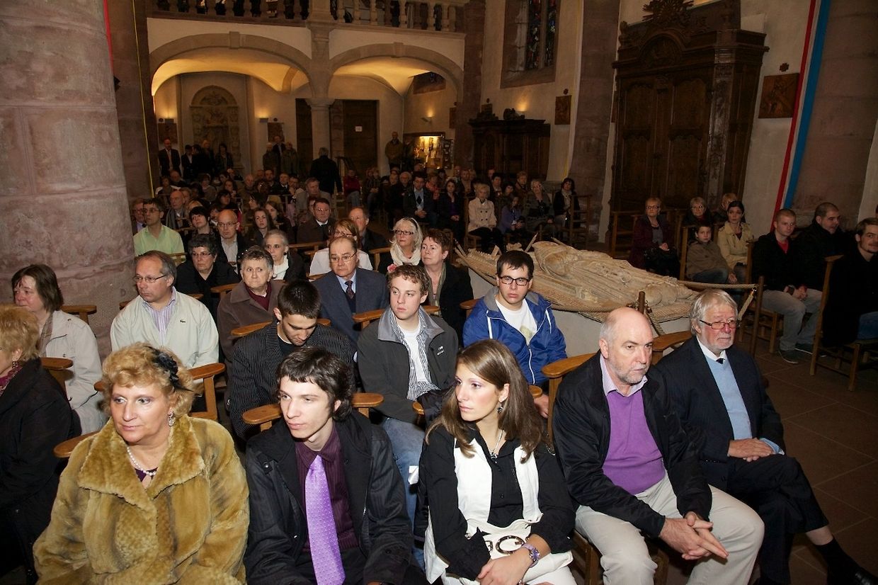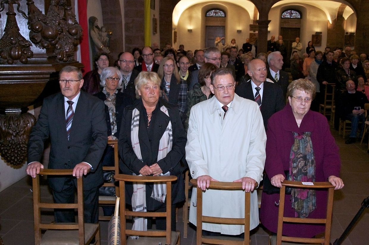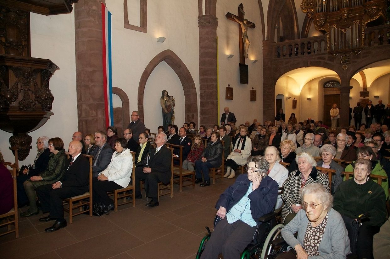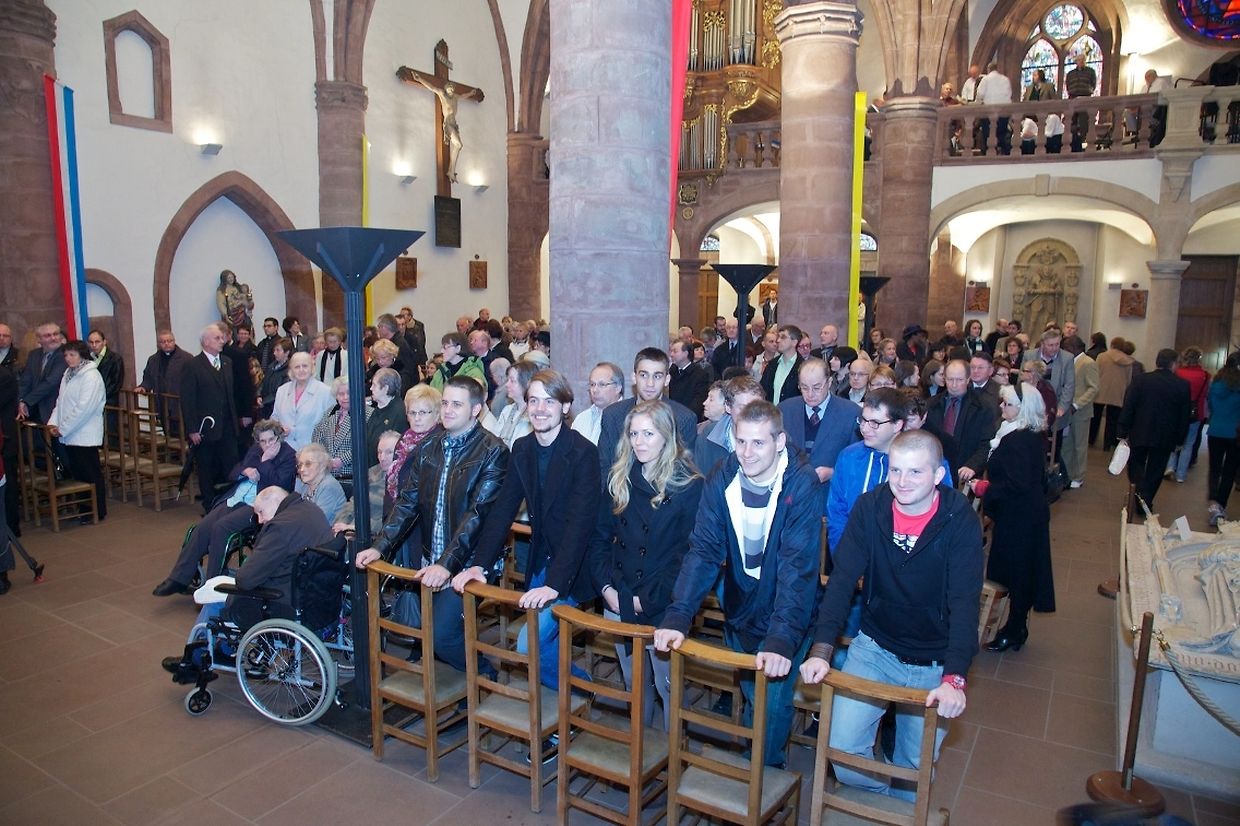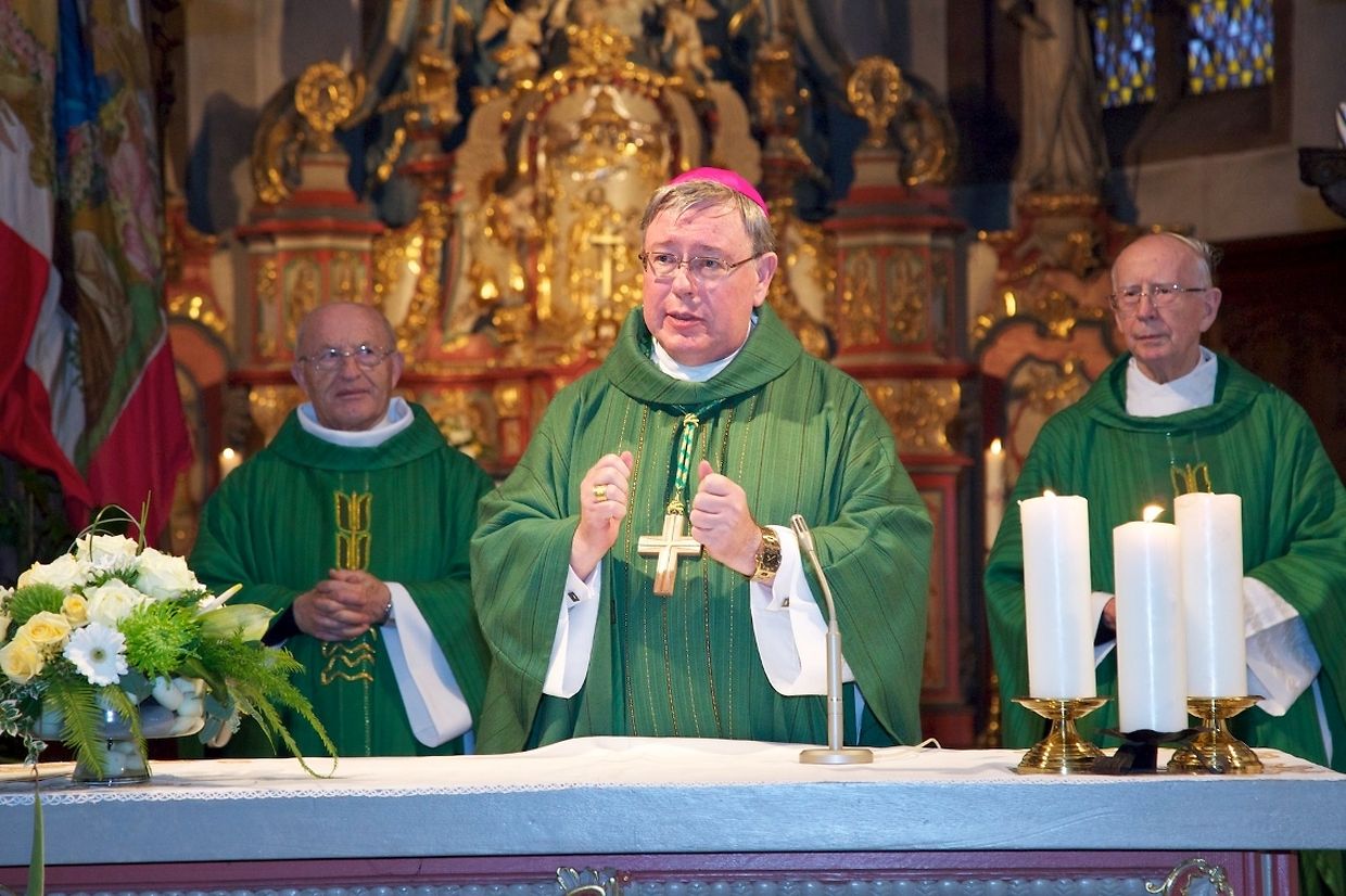Nachdem ihm seitens der Messdiener ein Blumenstrauß überreicht worden war, wurde der Erzbischof unter den Klängen der „Veiner Stadmusik“ im Umzug zum „Monuments aux morts“ geleitet, wo er Blumen zum Gedenken niederlegte.