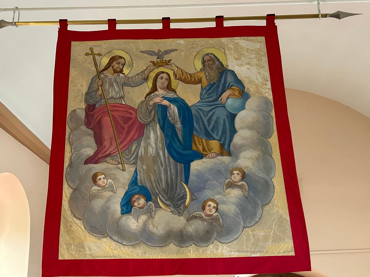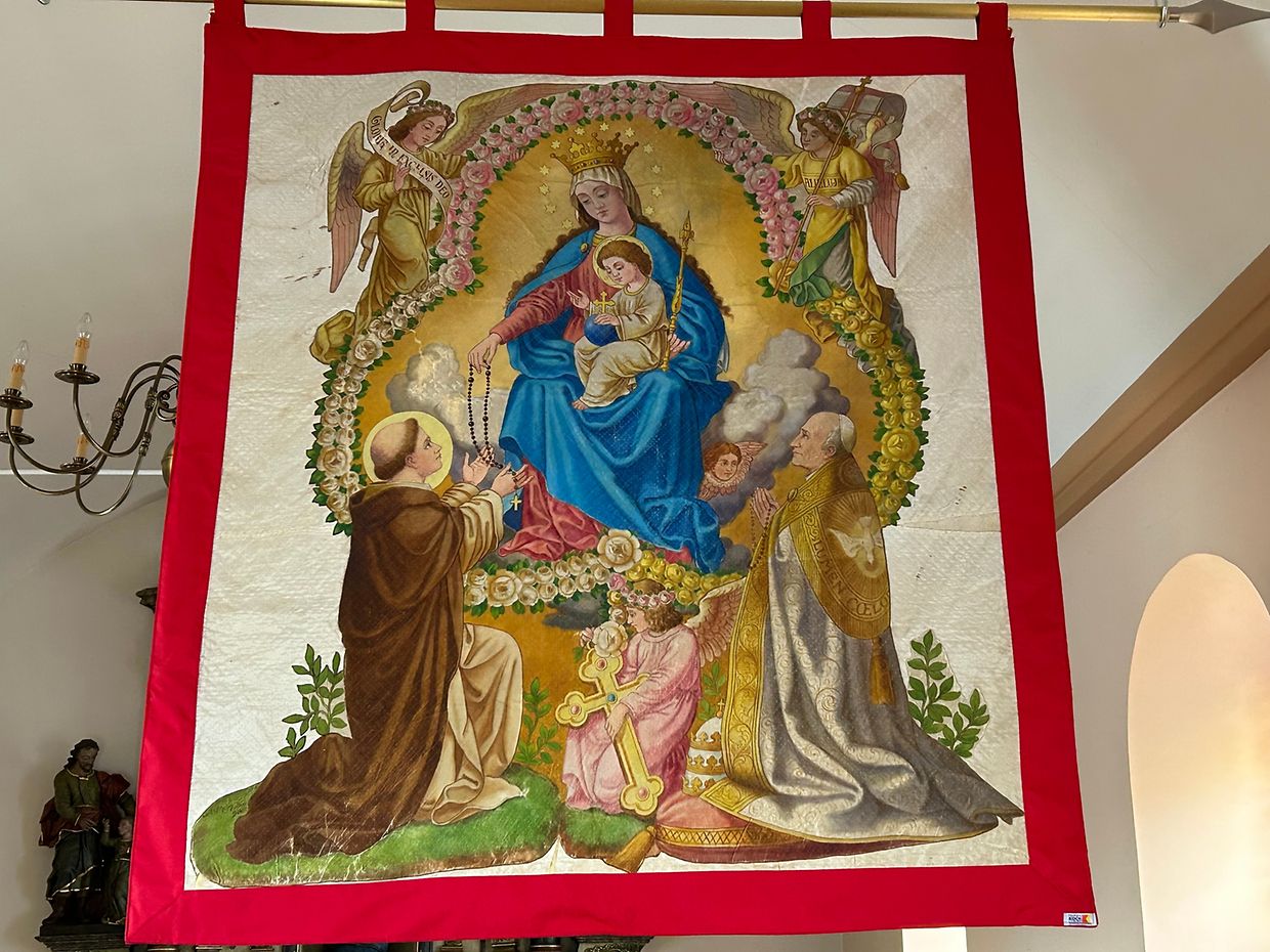 Eine neue, aus den beiden ehemaligen Fahnen hergestellte doppelseitige Fahne, zeigt auf der Vorderseite, die gekrönte Gottesmutter Maria, die dem hl. Dominikus den Rosenkranz überreicht, von Carl Wilhelmy aus dem Jahr 1924 und auf der Rückseite, die Krönung Mariens von Carl Wilhelmy aus dem Jahr 1935.