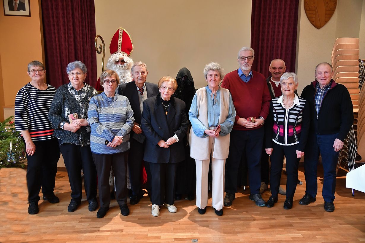 Viichten: Genau eng Woch virum schéine Fest vun der Geburt Jesu, huet de Comité vun de Seniorefrënn Vichten der Traditioun entspriechend, hir Memberen op d’Chrëschtfeier an de Festsaal agelueden. Noodeems dat jidderengem de Festmenü gut geschmaart hat, koum et, esou wi schon di Joeren virdrun zur Éierung vun de Jubilaren, déi am Laaf vum Joer 2021 Geburtsdag feiere konnten. No de Gléckwënsch vun der Presidentin Triny Pletschette sin zesummen mam Kleeschen an Housëcker folgend Memberen vum Senioreveräin mat engem Cado geéiert gin: Maggy Leider- Arendt (70 Joer); Madelaine Kemmer, Frank Loomans, Annette Philippe- Berchem an Armand Wilmes (75). Och e Cado fir den 90.Geburtsdag gouf et fir d’Suzanne Porcher-Kirtz. Folgend Jubilaren déi deser Feier nit konnten bäiwunnen ass och gratuléiert gin: Charles Neises an Claude Rodenbrod (70); Robert Jacoby, Camille Philippe-Berchem an Tilly Scheuren (80); Léonie Kieffer (85) a Julie Wohl (90). Als Afschloss vun deser schéiner Chrëschtfeier huet d’Presidentin mat hirem Comité jiderrengem Alles Guddes gewënscht mat der Hoffnung sech nees am Joer 2022 gesond a monter erëm ze gesin. (CR) (Foto: Charles Reiser)