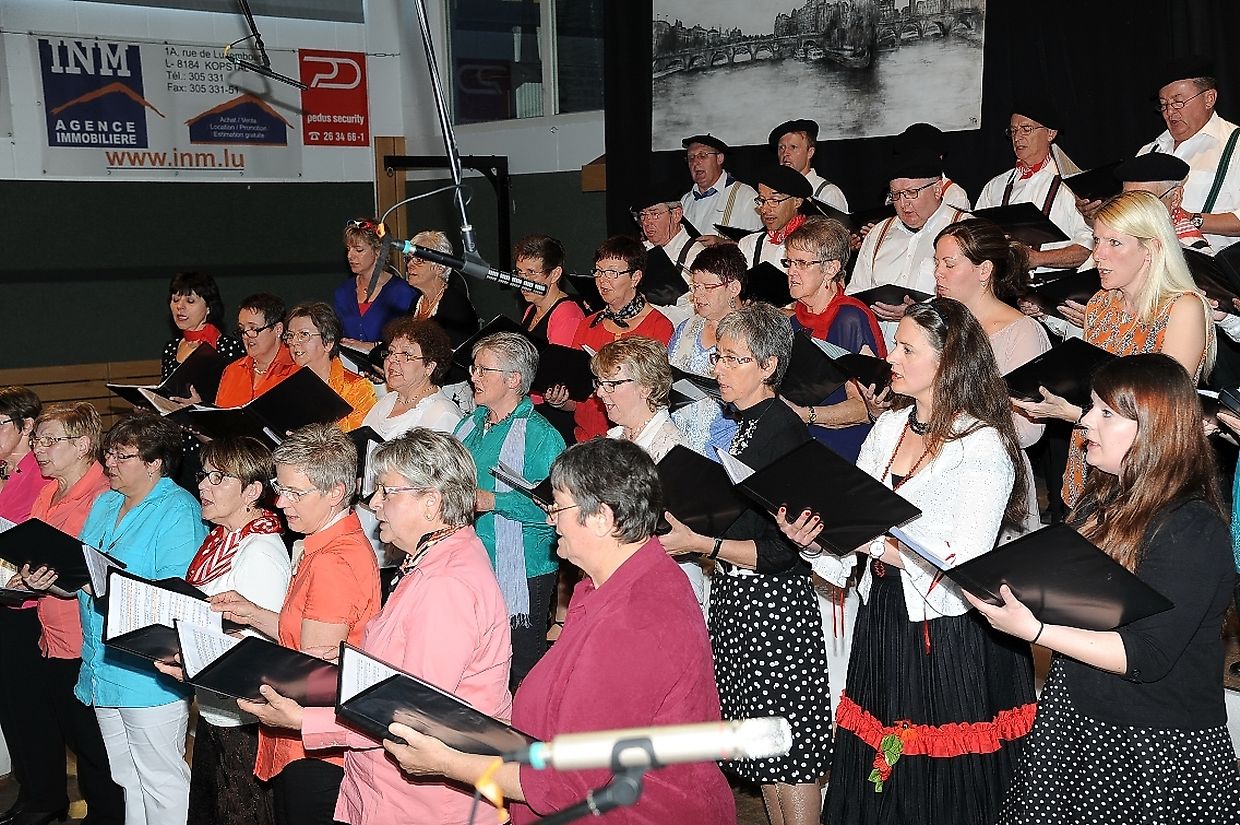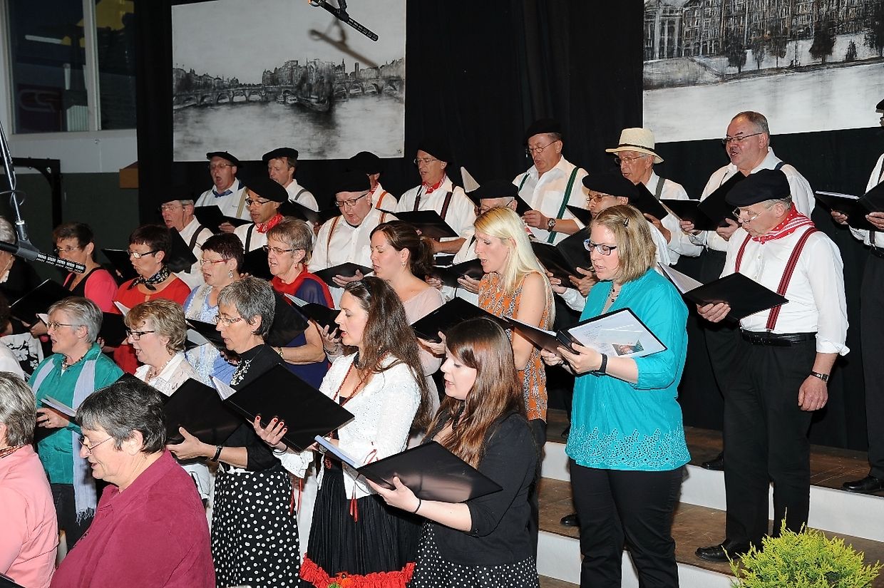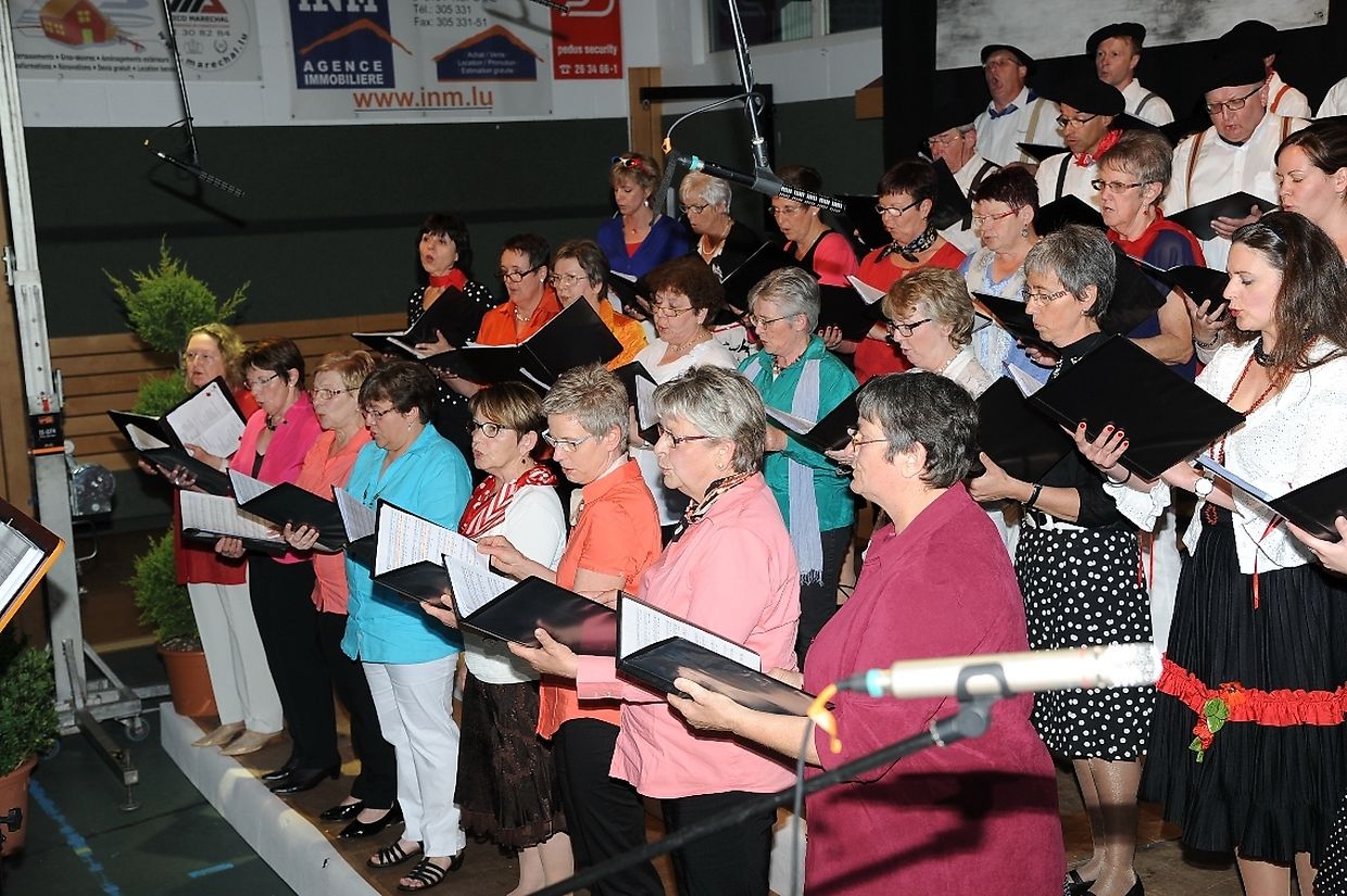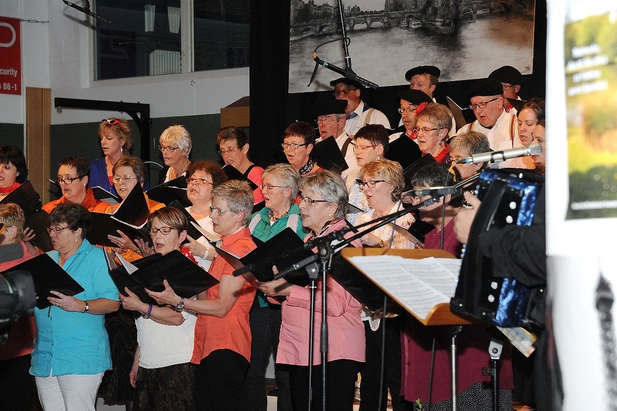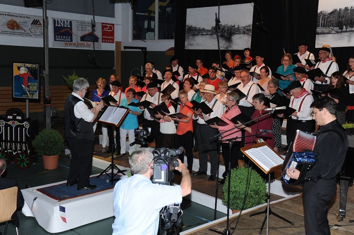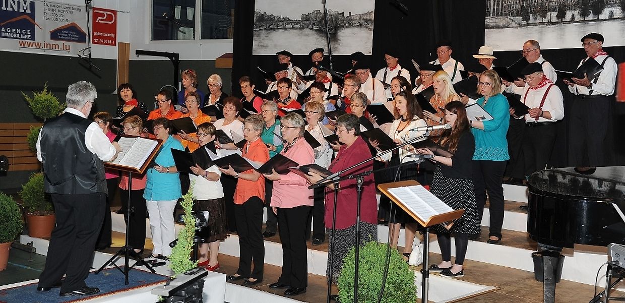 Mat franséische Chansons " à la carte" konnten d'Gesangveräiner vu Colmer- Bierg a Viichten zesumme mat hire Frënn ganz vill Gesangliebhaber op hirem Franséischen Owend e Mëttwoch, den 28. Mee an der Sporthaal zu Viichten iwerzeegen. Dese Concert stong ënnert dem Protektorat vun der Colmer a Viichtener Kulturkommissioun. Ënnert der Leedung vum Dirigent Henri Bissen sin ganz schéin a bekannt franséisch Lidder, wéi les Bales populaires, Etoile des neiges, l'important c'est la rose, les lacs du Connemara , Printemps du Charmeur bis hin zu Toutes les femmes sont belles, vun denen ronn 40 Sängerinnen a Sänger mat Bravour op eng professionell Manéier interprétéiert gin. Och d'Solistin Sylvie Schartz- Kips huet di zwee Lidder - Baccarole an Après un rève - mëschterhaft virgedroen. D'Sänger goufe begleet vum Caroline Plekkepoel a Sylvie Schartz- Kips um Keyboard, dem Janos Nadasi um Piano, dem Vania Lecuit op der Géi a vum Maurizio Spiridigliozzi um Akkordeon. Durch den flotten Owend den vun allen Uwiesenden mat vill Applaus honoréiert gouf, huet d'Marianne Kugener- Goethals gefouert. Wien sech dese Concert nach e Mol wëllt unhéieren, kann dat dese Samsdeg den Owend ëm 20 Auer am Kulturtzënter zu Colmer- Bierg mat erliewen (TEXT A FOTOEN: CHAREL REISER)