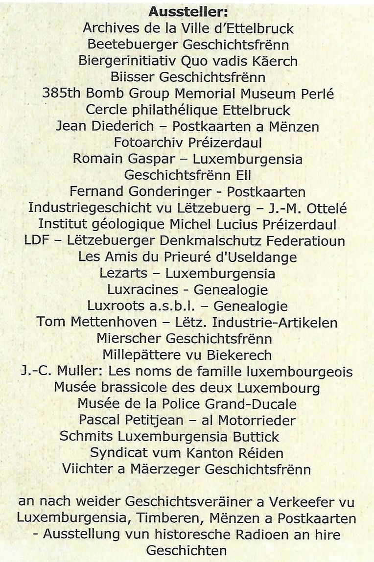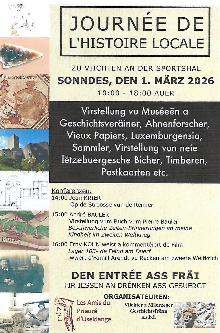 Eng nächst Aktivitéit vun de Viichter a Mäerzeger Geschichtsfrënn ass déi 11. Journée de l’Histoire locale, déi d’Geschichtsfrënn, zesumme mat Les Amis du Prieuré d’Useldange, zu Viichten an der Hal organiséieren. Den 1. Mäerz 2026 ass do eng Virstellung vu Muséeën, Geschichtsveräiner, Anefuerscher, Sammler vun Timberen, Postkaarten, Mënzen an Industrie-Artikelen an nei an al Luxemburgensia. Nomëttes si Konferenzen an eng Filmvirféierung vun den Hären Jean Krier, André Bauler an Erny Kohn. Dir sidd häerzlechst invitéiert – den Entrée ass fräi.