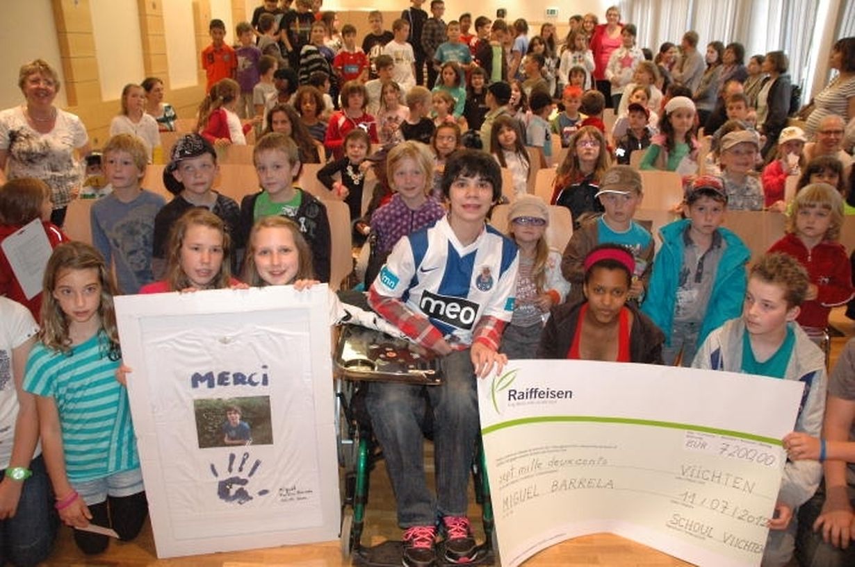 Im Rahmen des Schulfests in Vichten am vergangenen Mittwoch wurde der Scheck schließlich an Miguel und seine Familie überreicht. Nachdem die Schüler der sechsten Klasse nochmal an das tragische Schicksal ihres ehemaligen Mitschülers erinnert hatten, schenkten diese dem jungen Fußballfreund auch noch ein Trikot seines Lieblingsvereins FC Porto. Als Dankeschön für die großzügige Aktion überreichte Miguel zusammen mit seinen Eltern der Schule anschließend noch ein eingerahmtes T-Shirt mit der Aufschrift „Merci“ und einem Foto von ihm. (PGr)