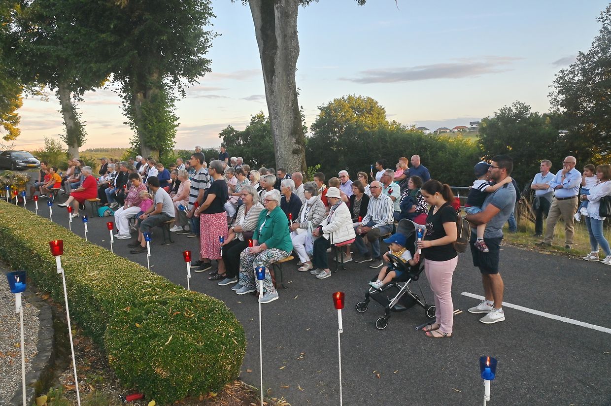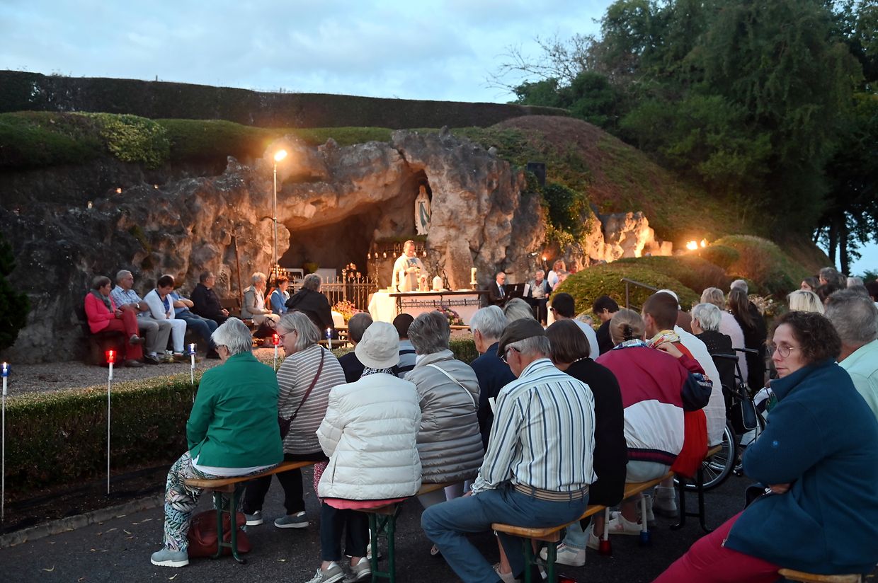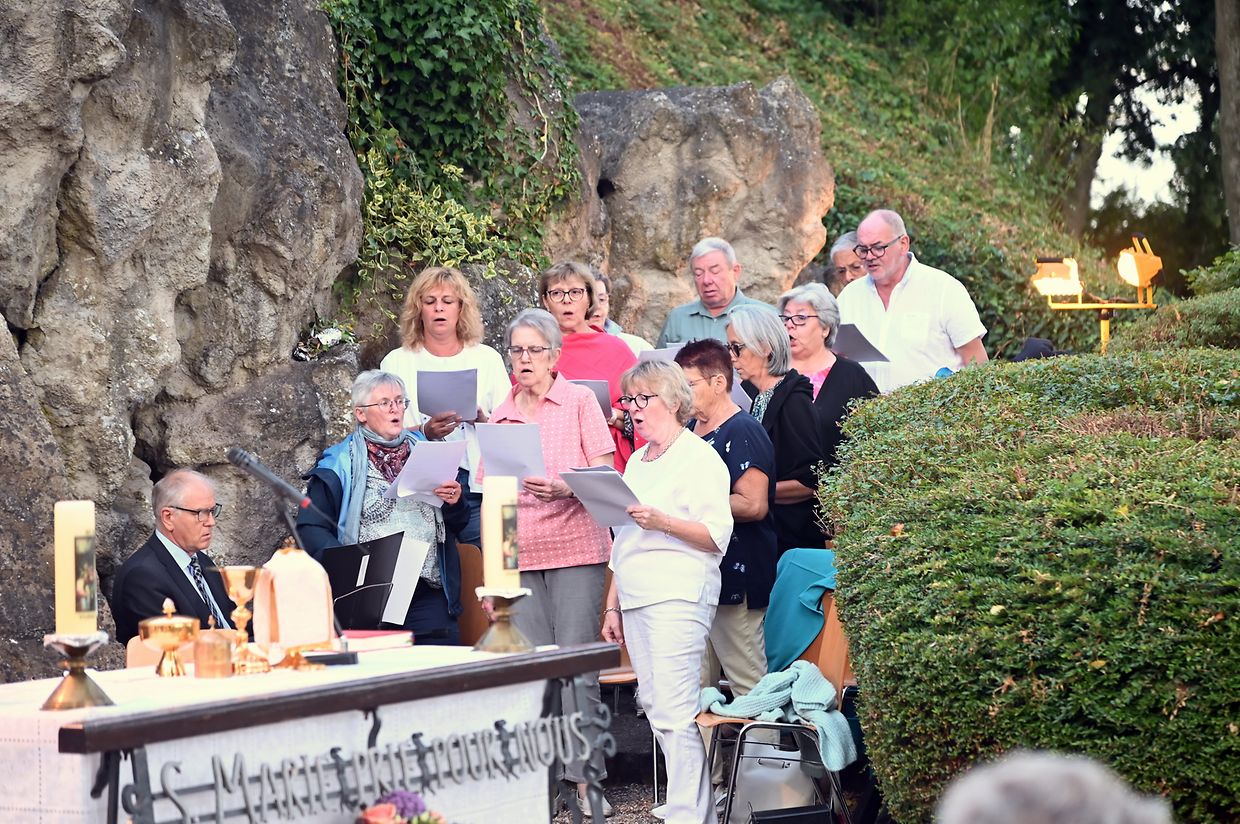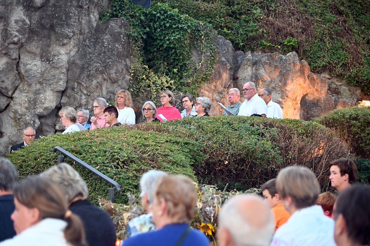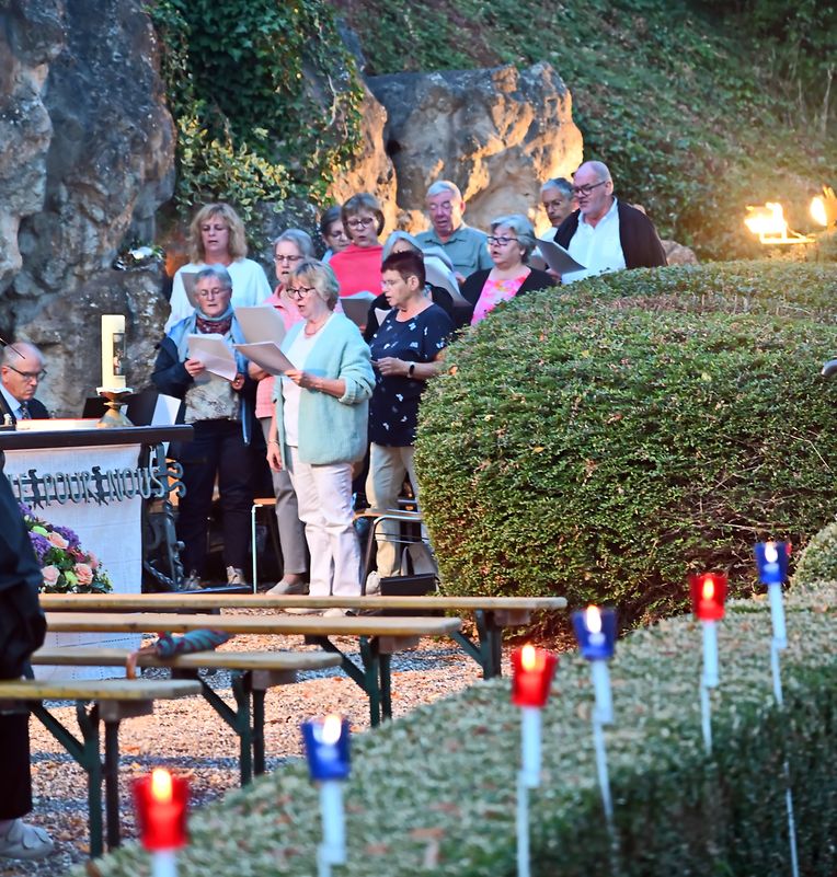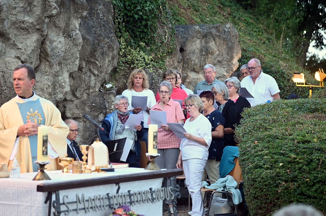 Traditionell Liichterprëssioun op Mariä Himmelfahrt vun der Kierch bei Lourdes Grotte mat Festmass a Seene vum Wësch. De Gottesdëngst gouf zelebréiert vum Abbé Vincent Billot a gesanglich verschéinert vun der Union Chorale Vichten. (CR ) (Fotoen: Charel Reiser)