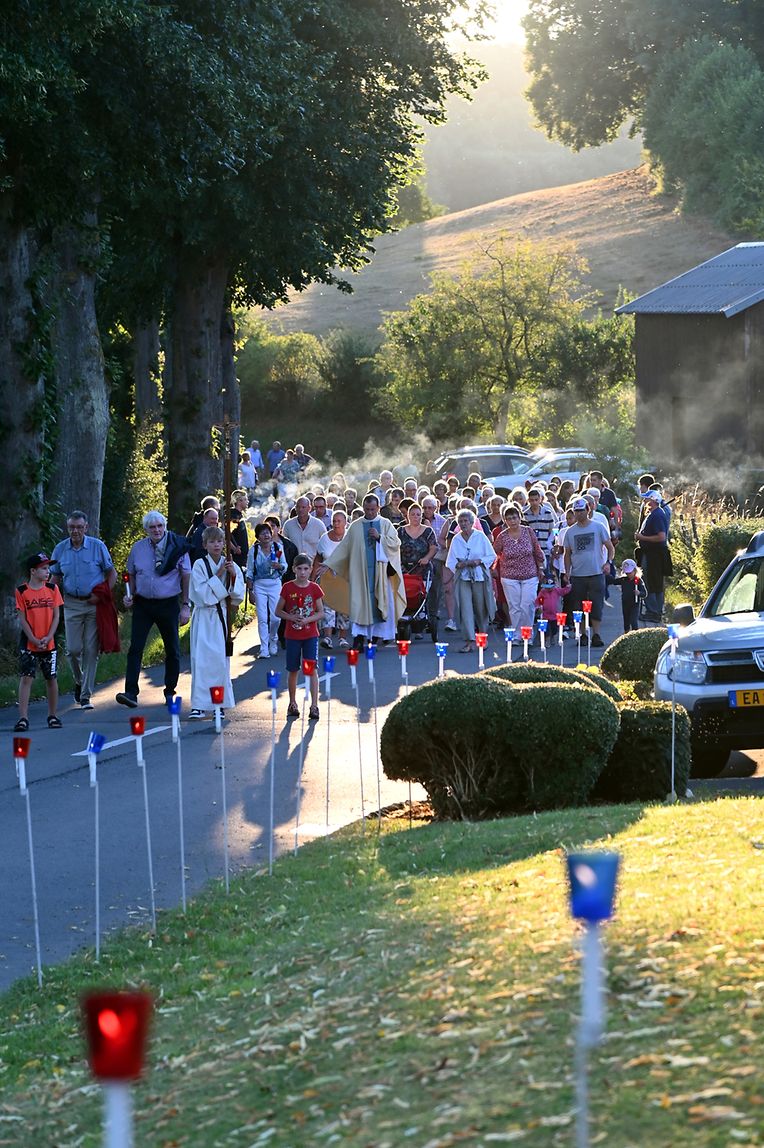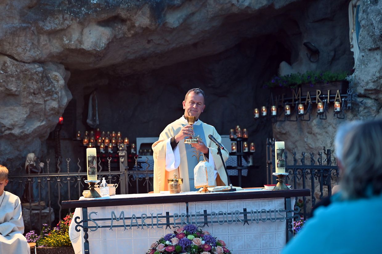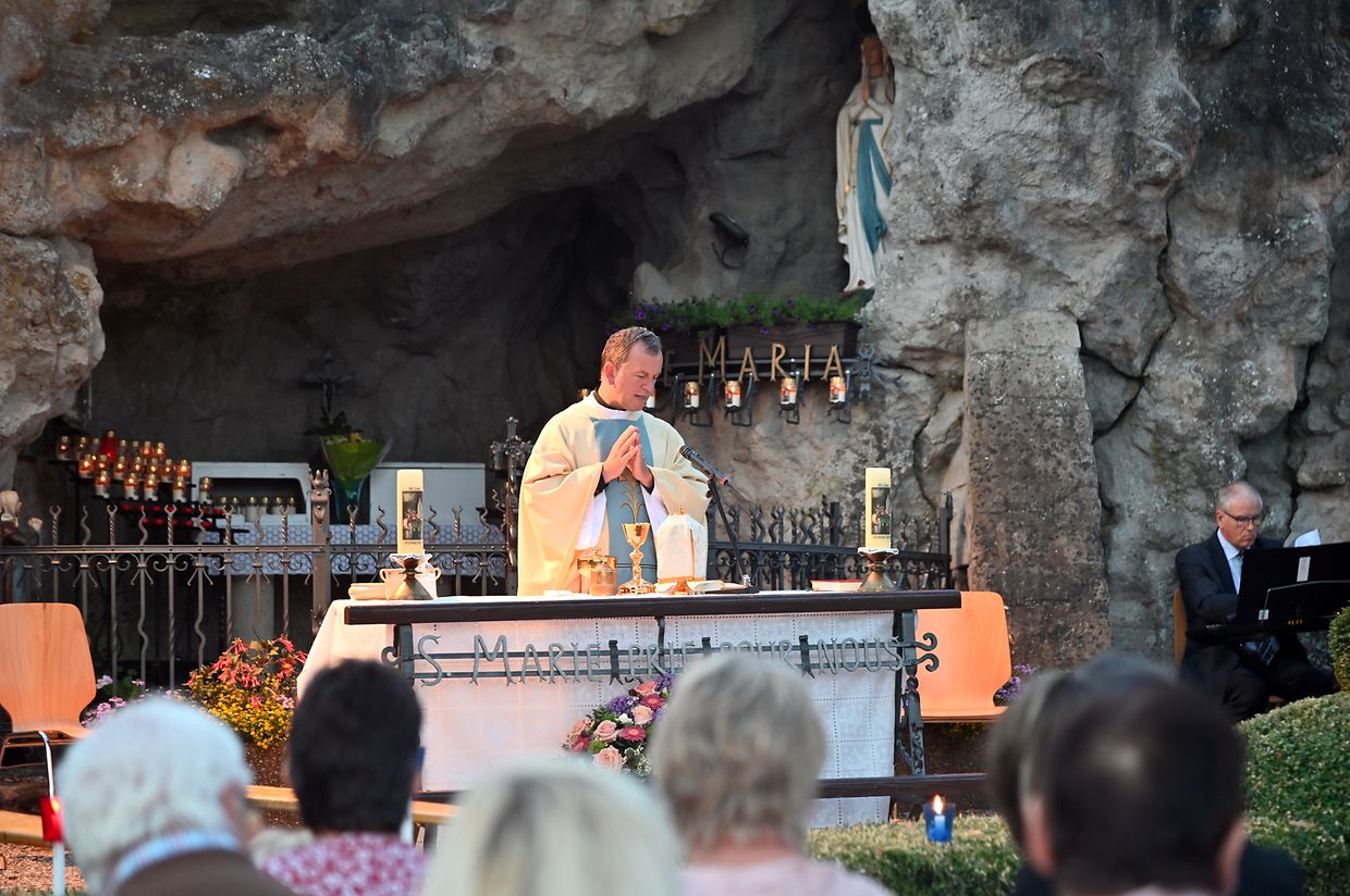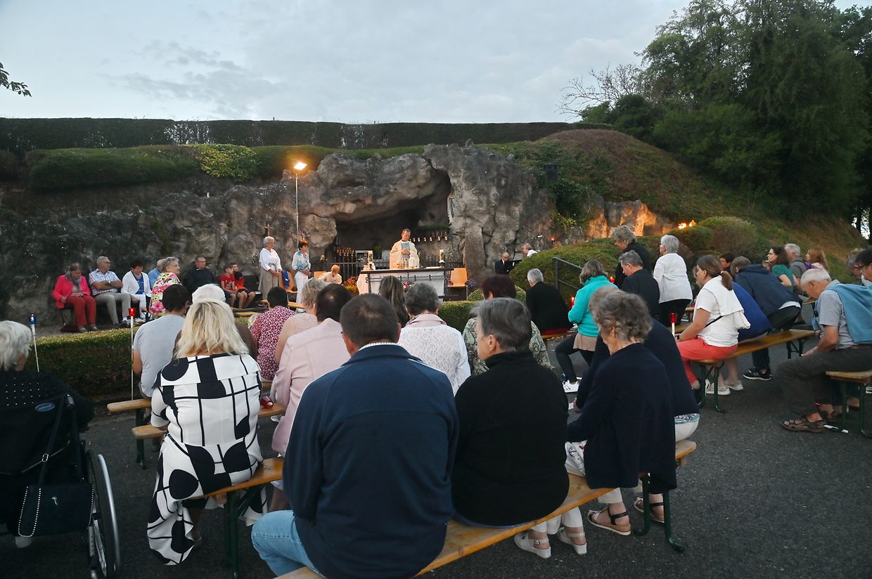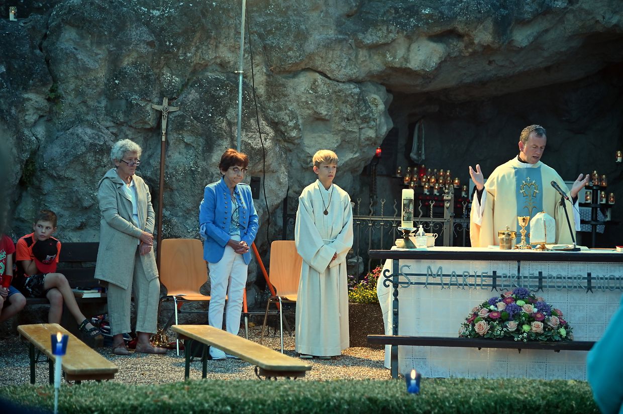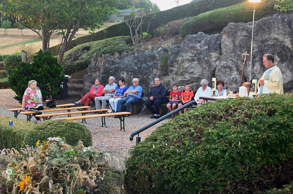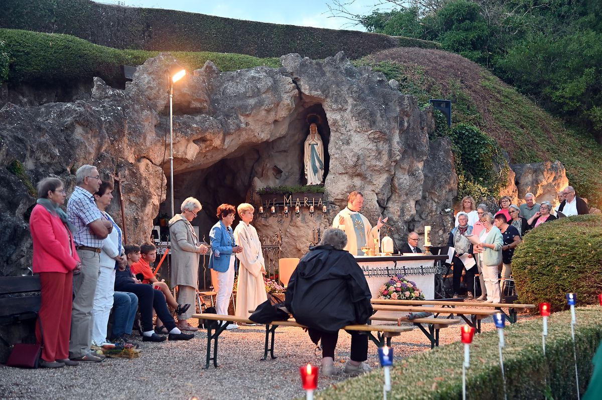 Traditionell Liichterprëssioun op Mariä Himmelfahrt vun der Kierch bei Lourdes Grotte mat Festmass a Seene vum Wësch. De Gottesdëngst gouf zelebréiert vum Abbé Vincent Billot a gesanglich verschéinert vun der Union Chorale Vichten. (CR ) (Fotoen: Charel Reiser)