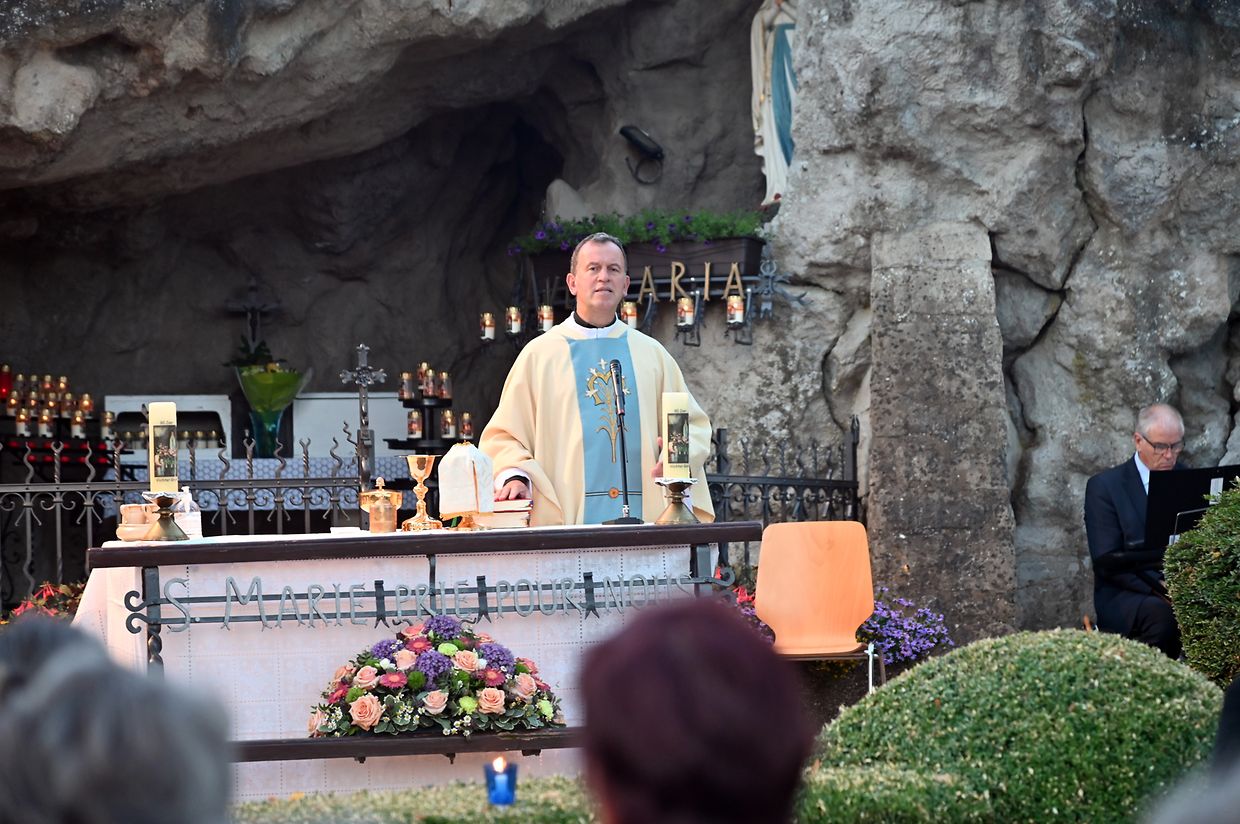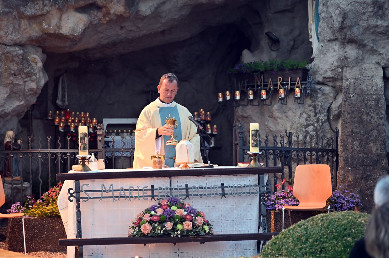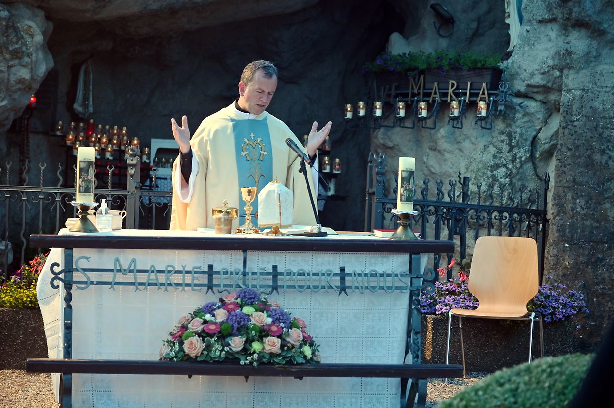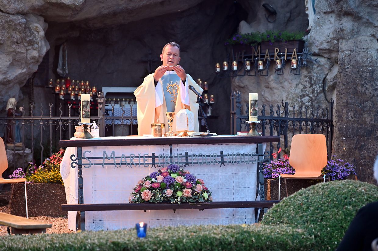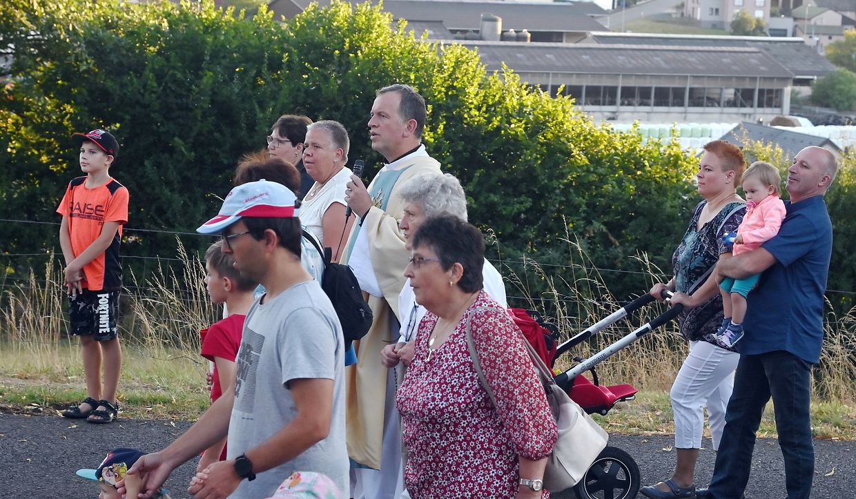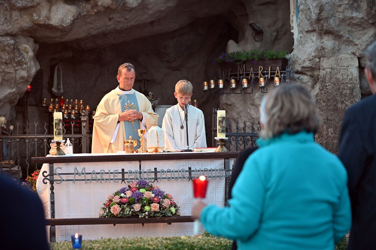 Traditionell Liichterprëssioun op Mariä Himmelfahrt vun der Kierch bei Lourdes Grotte mat Festmass a Seene vum Wësch. De Gottesdëngst gouf zelebréiert vum Abbé Vincent Billot a gesanglich verschéinert vun der Union Chorale Vichten. (CR ) (Fotoen: Charel Reiser)