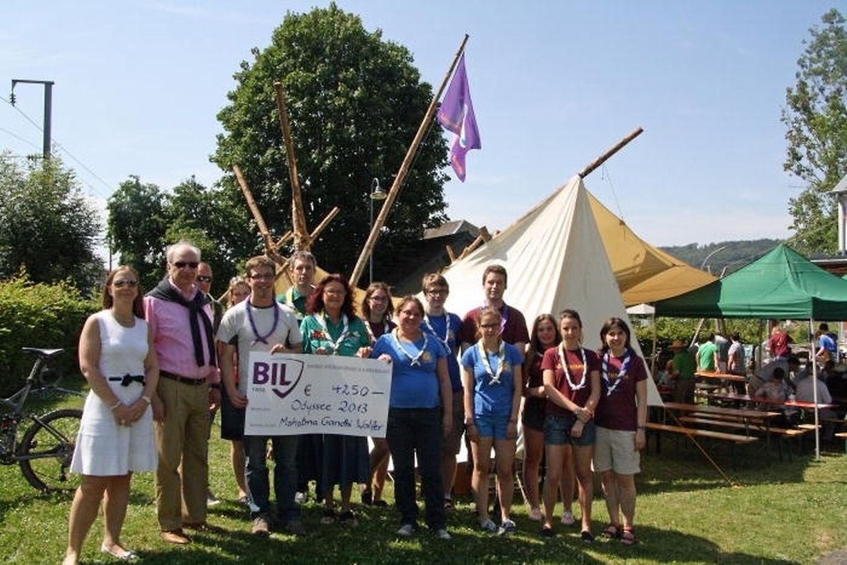 Bei dieser Gelegenheit überreichten Gruppenchefin Annick Lamesch und Jacques Dostert eine Spende von 4 250 Euro an Anne Blau, Verantwortliche des Projektes „Odysee 2013“. Die Spende ist der Erlös aus dem Burgbrennen in Walferdingen, das von der lokalen Pfadfindergruppe veranstaltet worden war. Bereits im März dieses Jahres weilten 21 Ranger/Rover, wie die Gruppe der 17- bis 23-Jährigen bei den Pfadfindern heißt, in „Kiran Village“ in Indien und bauten zusammen mit behinderten Kindern einen Schulsaal. Weitere Projekte werden in Georgien, im Senegal, in Bosnien und Brasilien während der Sommerferien in Angriff genommen. Insgesamt werden 120 „Lëtzebuerger Guiden a Scouten“ – davon 20 aus Walferdingen – an diesen Projekten teilnehmen, die u. a. daraus bestehen einen Spielplatz zu bauen, eine Schule einzurichten oder ein Pfadfinder-Zentrum zu errichten.
