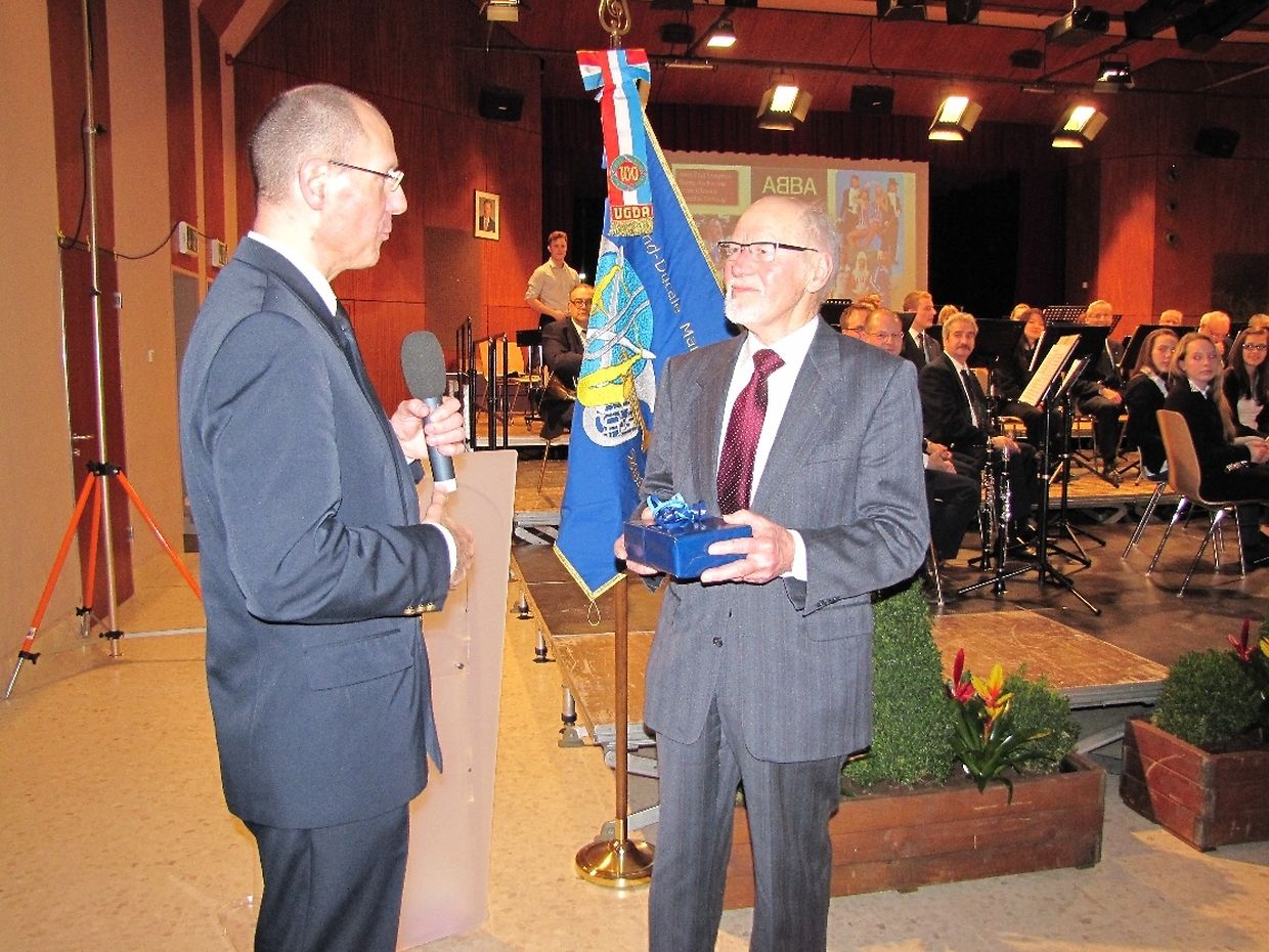 Vor dem Ende des Konzertes wurde René Koster besonders geehrt. Über 60 Jahre war er der Musik treu verbunden, bei allen Proben und Ausgängen war er präsent. Leider musste er aus gesundheitlichen Gründen 2012 seine musikalische Rente nehmen. Für seine Treue bekam René Koster ein besonderes Geschenk überreicht.
