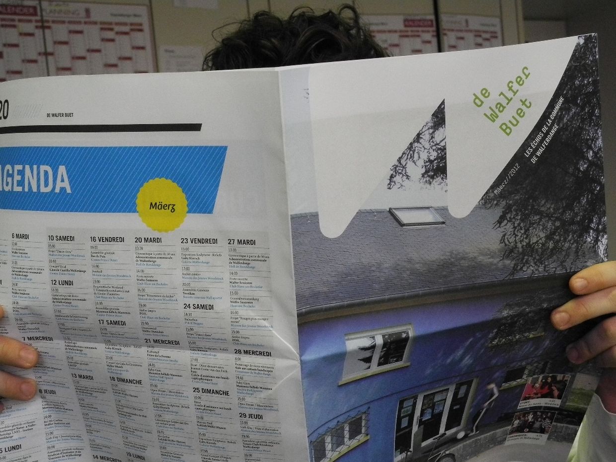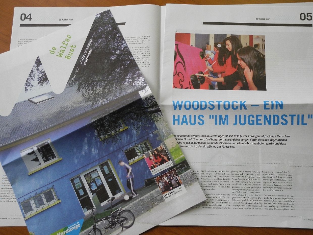 (L.E.) - Soeben ist die März-Ausgabe der gemeindeeigenen Zeitung „de Walfer Buet“ erschienen. Aufmacher ist diesmal das Jugendhaus Woodstock in Bereldingen, das seit 1998 Anlaufpunkt für Jugendliche im Alter zwischen zwölf und 26 Jahren ist. Außerdem erfahren wir aus dem „Buet“ dass das diesjährige internationale Jugendferienlager der Partnergemeinden in Limana stattfinden wird. 10 Walferdinger im Alter zwischen 10 und 15 Jahren können daran teilnehmen. Interessenten finden das entsprechende Anmeldeformular im „Buet“.