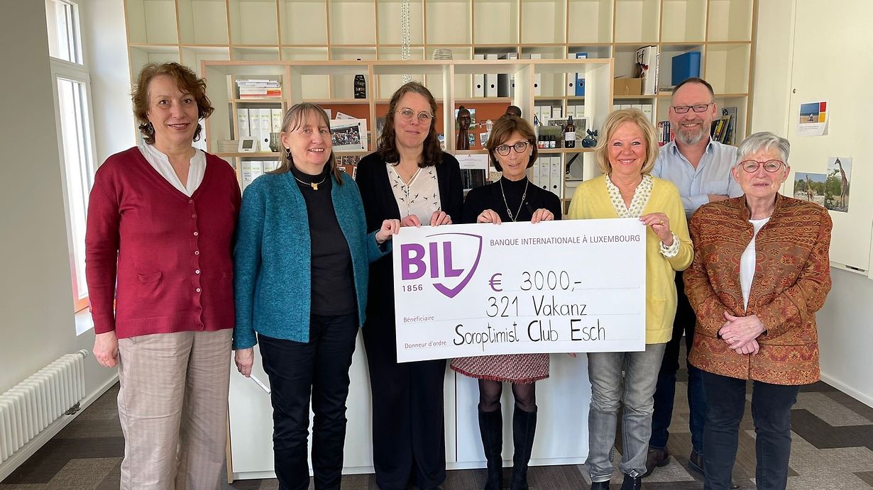 Eng Delegatioun vun den Escher Soroptimisten huet de 14ten Mäerz 2023 e Scheck vun 3.000,-€ un d’Madame Danièle PETESCH, Responsabel vum Service « 321 Vakanz » - a.s.b.l. Tricentenaire, a Präsenz vum Generaldirekter Christophe Lesuisse, konnten iwwerreechen.