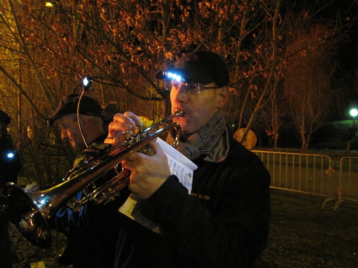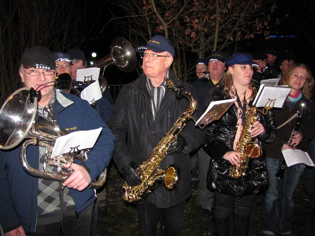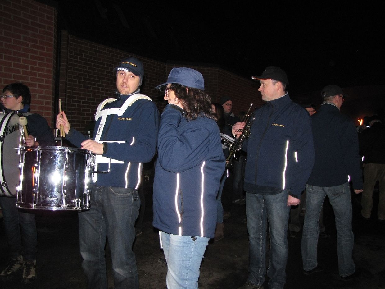 Umgeben von den Fackelträgern, haben die Musikanten den Umzug zur Burg angeführt. Die auf den Schirmmützen und Instrumenten angebrachten Lichtquellen erwiesen sich dabei als hoch effizient.
