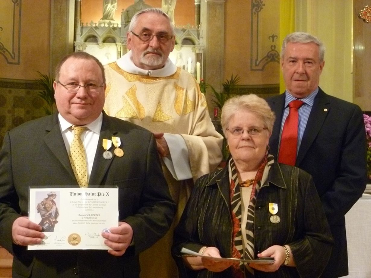 Zum Schluss vun der helleger Mass huet den Dechen Albert Backes der Madame Nicole Olm-Franziskus d’Bronzemedail fir 10 Joer aktiv Sängerin an dem Här Romain Schroeder fir 30 Joer aktive Sänger d’Goldmedail vum Piusverband iwwerreecht..