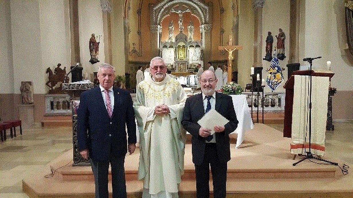 Fernand Aust, d'Goldmedail vum Piusverband fir 5o Joer Aktivitéit iwwerreecht.