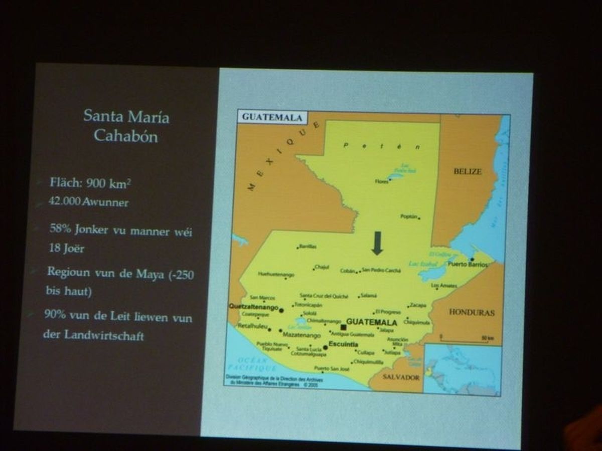 „ Säit éiwegen Zäiten hunn d’Maya-Q`eqchi’ aus Cahabón, am Guatemala, hier Felder no uraalen traditionelle Methode bestallt. Haut ass dat net méi méiglech. Ze vill Mënsche bevëlkeren d‘Regioun, et gëtt net méi genuch Akerland fir jiddereen. Des Situatioun gëtt duerch multinational Firmen, déi d’Land hektarweis opkafe fir Monokulturen unzeplanzen oder Rohstoffen auszebeuten nach verschlëmmert. Duerch intensiv Landwirtschaft, déi dem Buedem keng Phasë vu Rou méi gënnt, duerch dat traditionellt Ofbrenne vun de Felder, duerch déi zounehmend Erosioun an den Hiwwellandschaften ass déi fruchtbar Buedemschicht staark ugegraff, heiansdo huet si um Ufank vum Projet, virun zéng Joer, just nach 5 cm ausgemaach. An esou engem Buedem kann näischt wuessen.