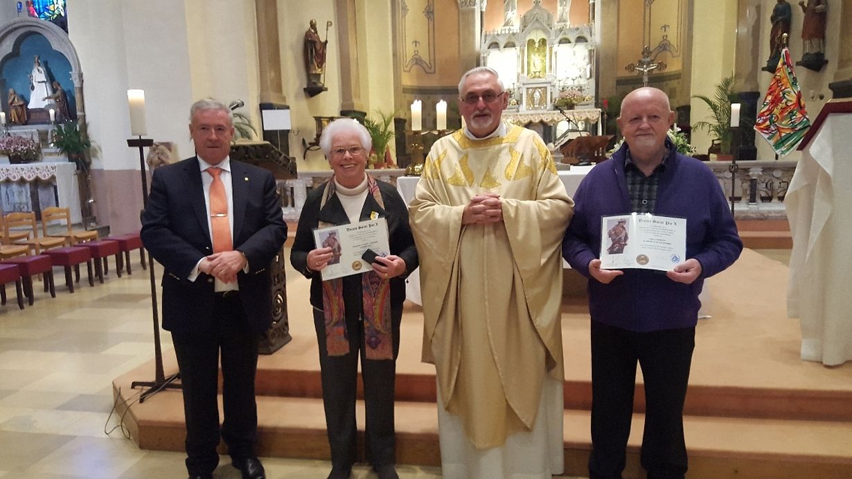 Zum Schluss vun der helleger Mass huet den Dechen Albert Backes der Madame Marguerite Schmit d‘Goldmedail fir 30 Joer aktiv Sängerin an dem Här Emile Lamesch fir 40 Joer aktive Sänger d’Goldmedail mat Palmetten vum Piusverband iwwerreecht..
