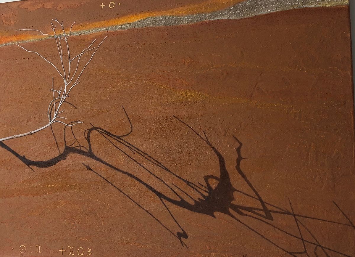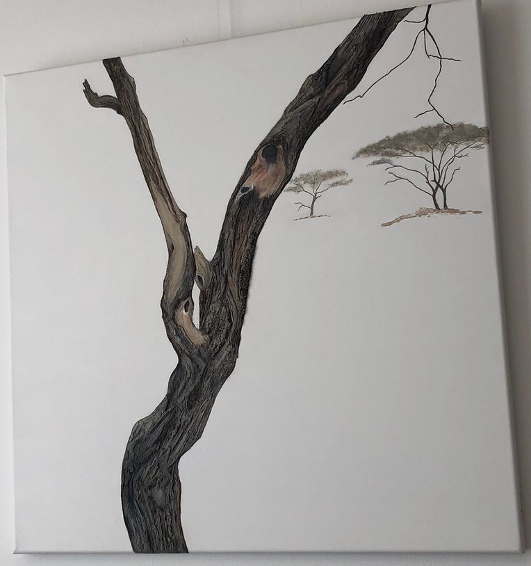 Aime incorporer des éléments de la nature dans les tableaux Travaille avec pinceaux, spatule, mains, éponge.