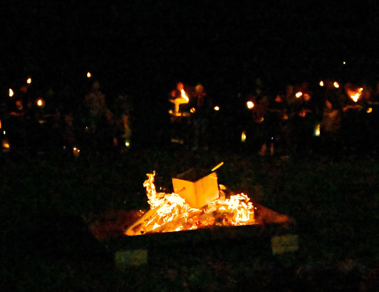 Danach stellte sich der Laternenumzug auf hinter St. Martin zu Pferd und führte zum Martinsfeuer, wo St. Martin seinen Mantel mit dem Bettler teilte.